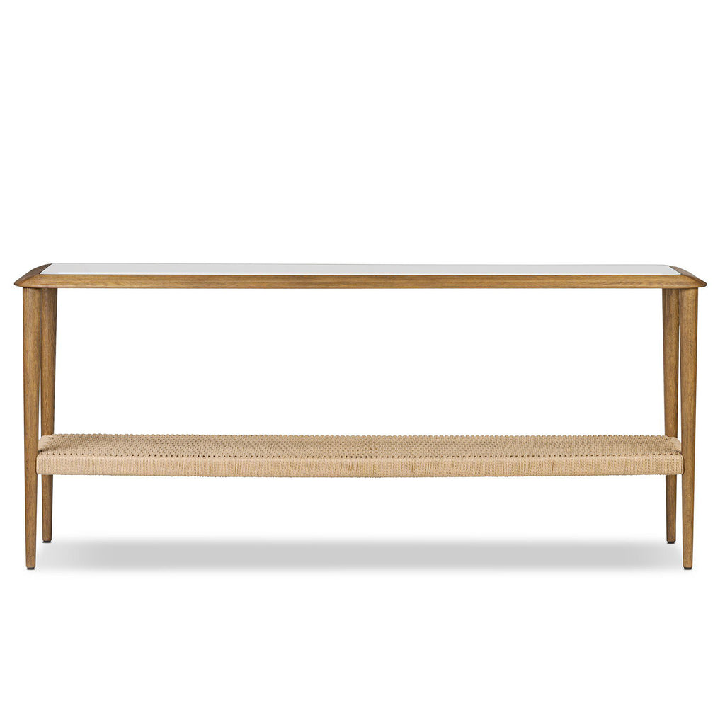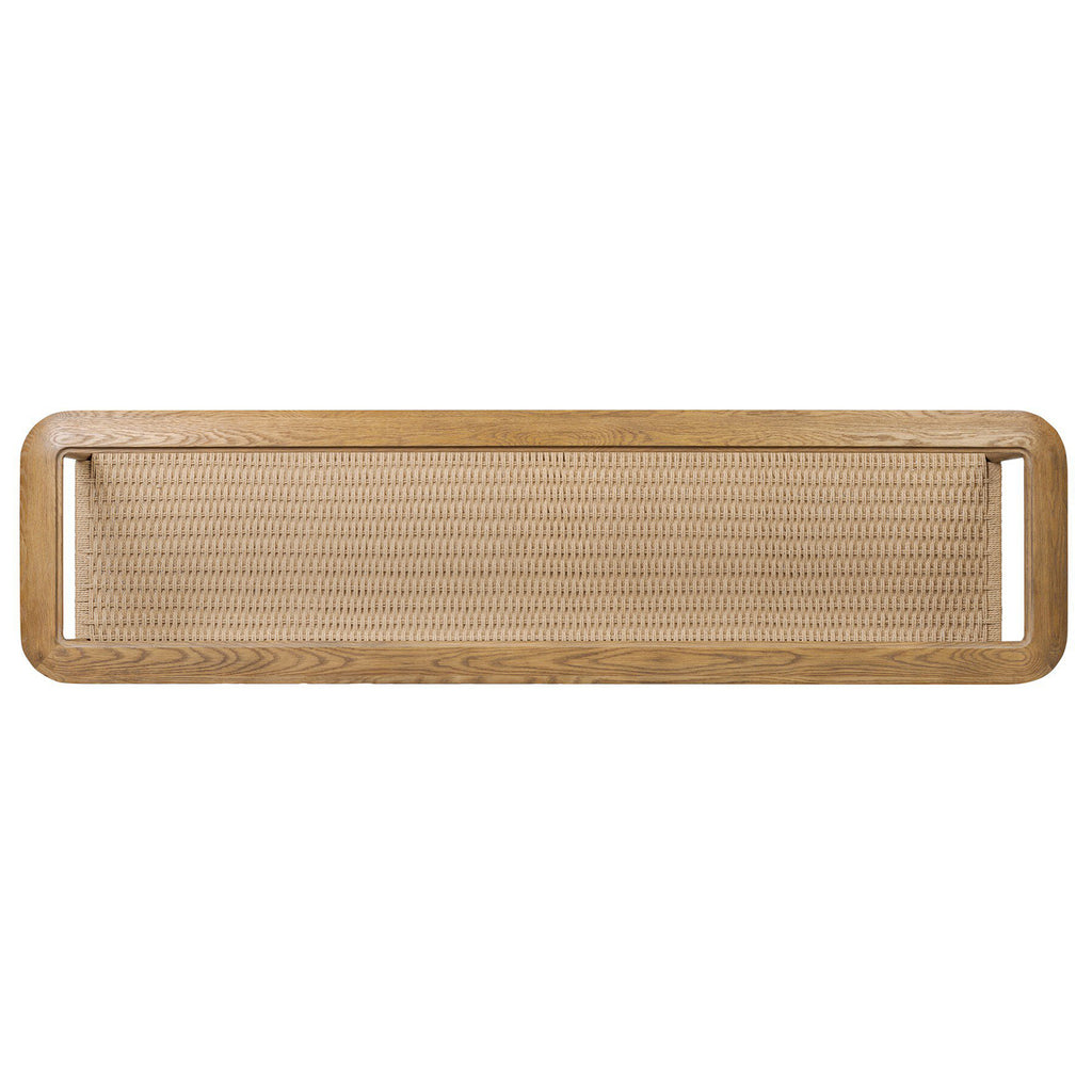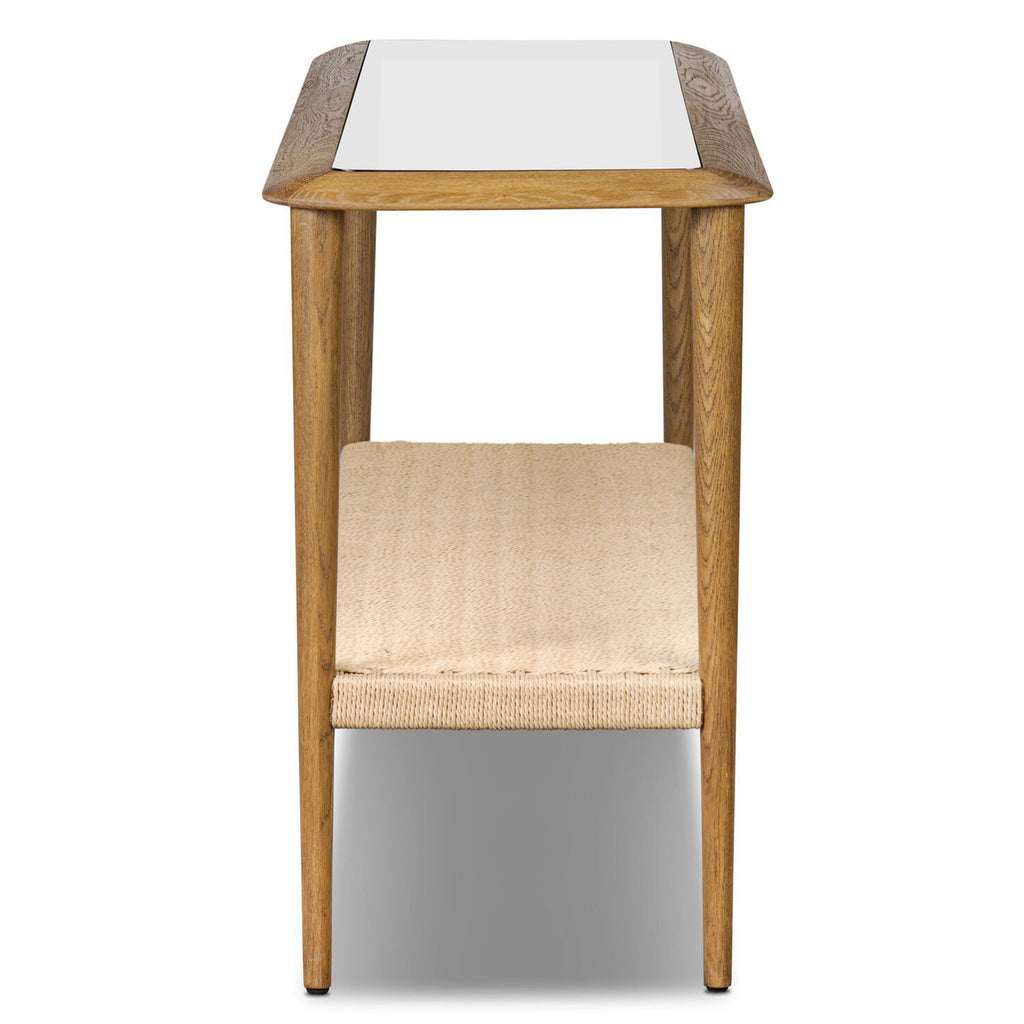 Made from brown oak, woven paper cord and tempered glass, an open-style console works into any space or style with ease, thanks to its beautifully versatile design.