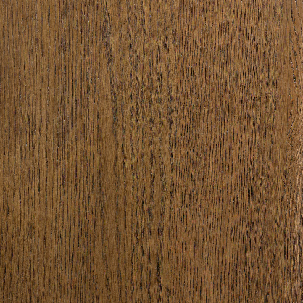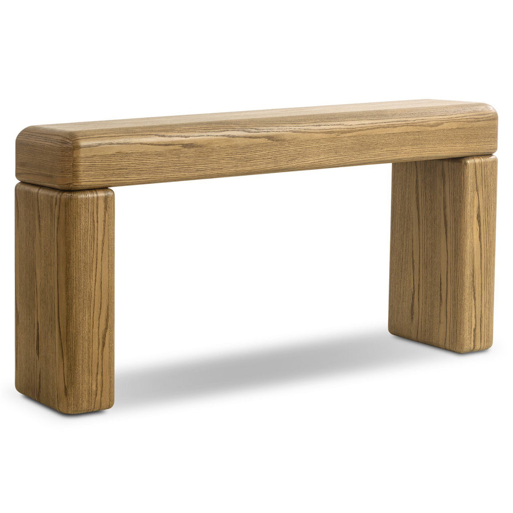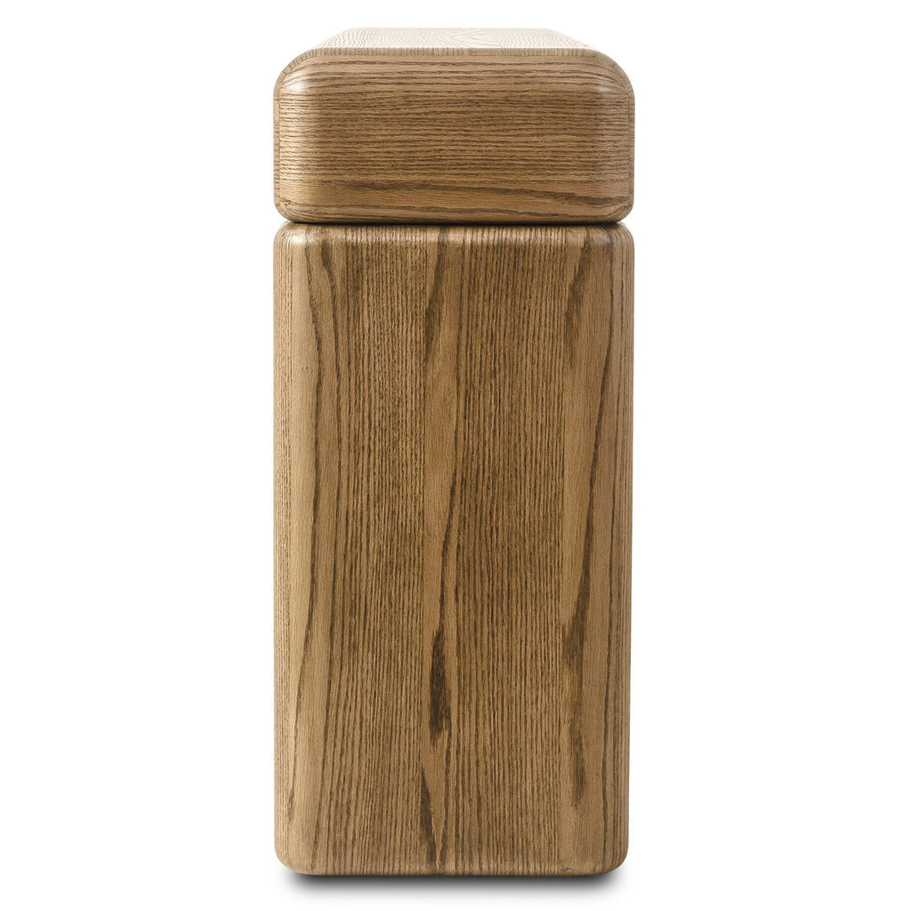 Crafted of warm oak veneer, dramatic proportions balance a streamlined waterfall shape in this contour-driven console. Exaggerated round corners soften the whole look.