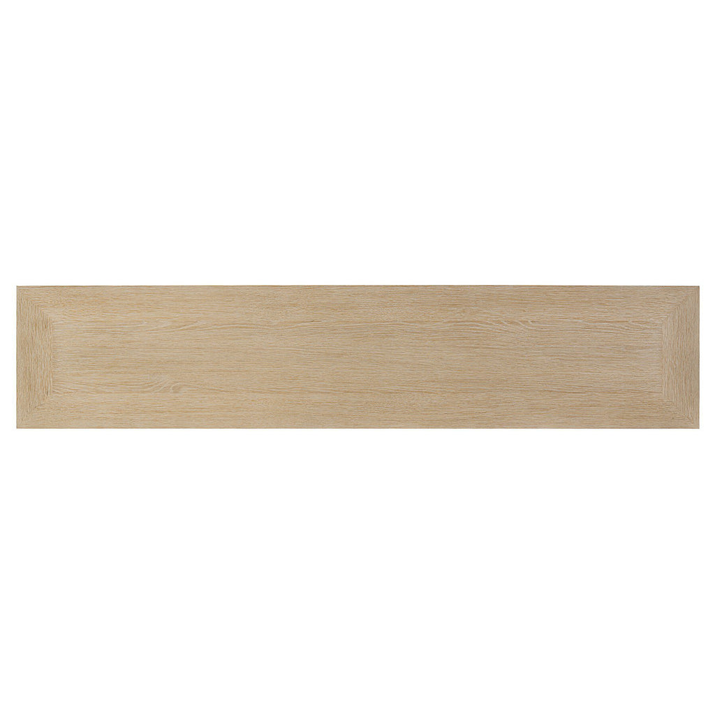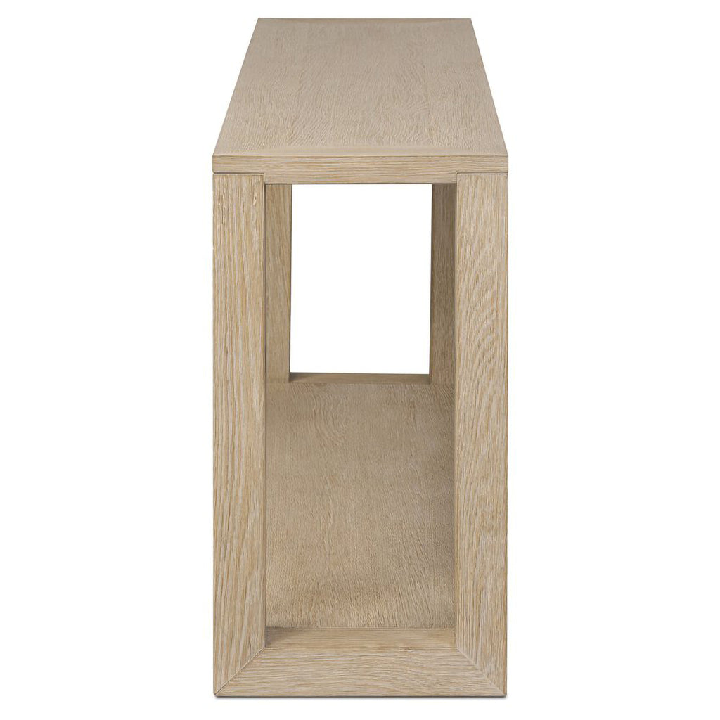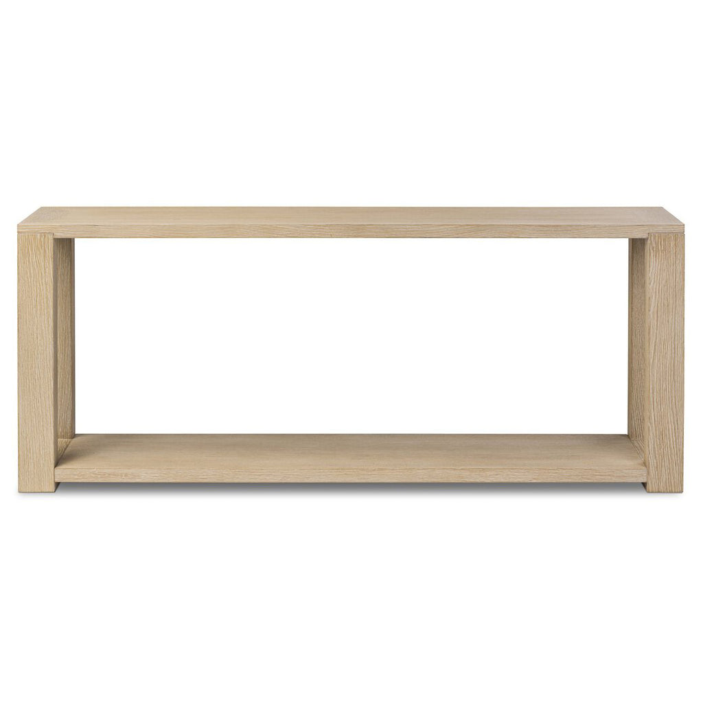 Made from bleached solid oak, a long, open-style console table brings a light, clean look to your living or media room. Lower shelving brings bonus storage and display of media, favorite books and more.