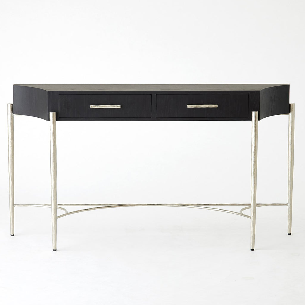 The Breakfront Console features a sleek, modern design with soft curves and clean lines that create a bold, visual statement. Handcrafted from oak with a rich black finish and complemented by nickel-plated iron accents, this console combines sophistication with functionality, offering ample space for decorative displays.
