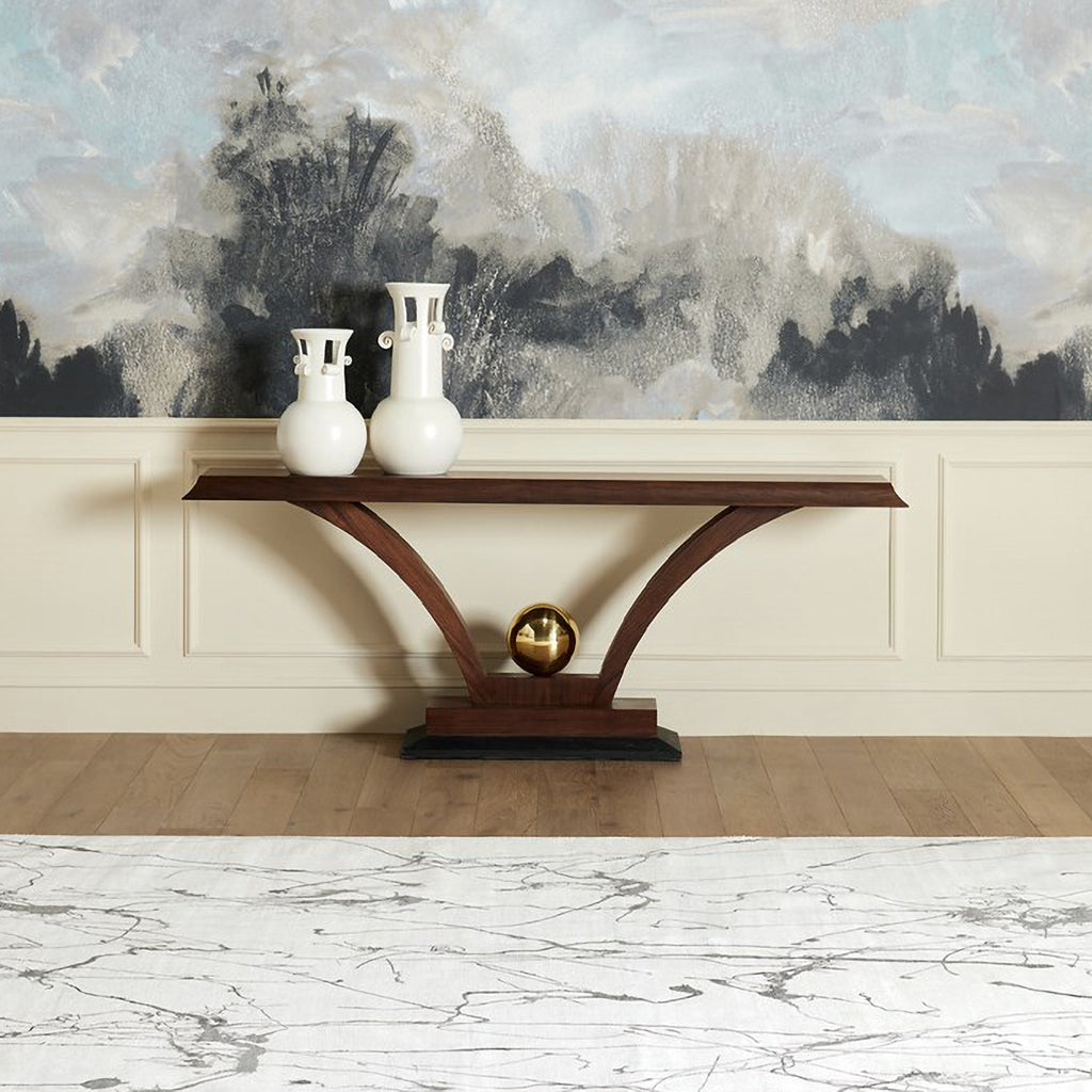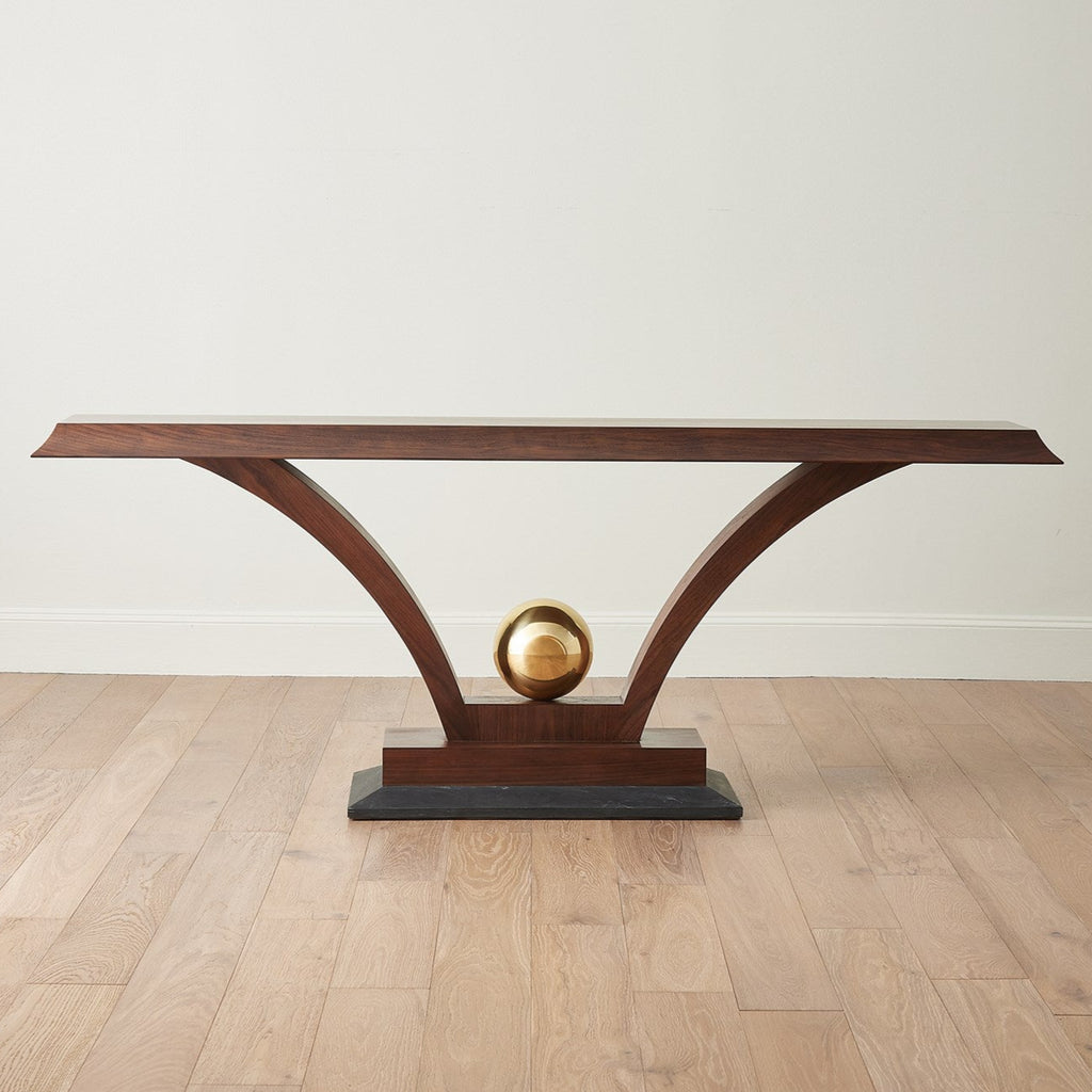 The Colby Console, designed by Edward Nader for Global Views, blends classic sophistication with modern style. Handcrafted from walnut and veneer, it features graceful curves and a sleek black marble base. A sculptural brass sphere serves as the focal point, and its extra-long length creates a bold, commanding presence in any space.