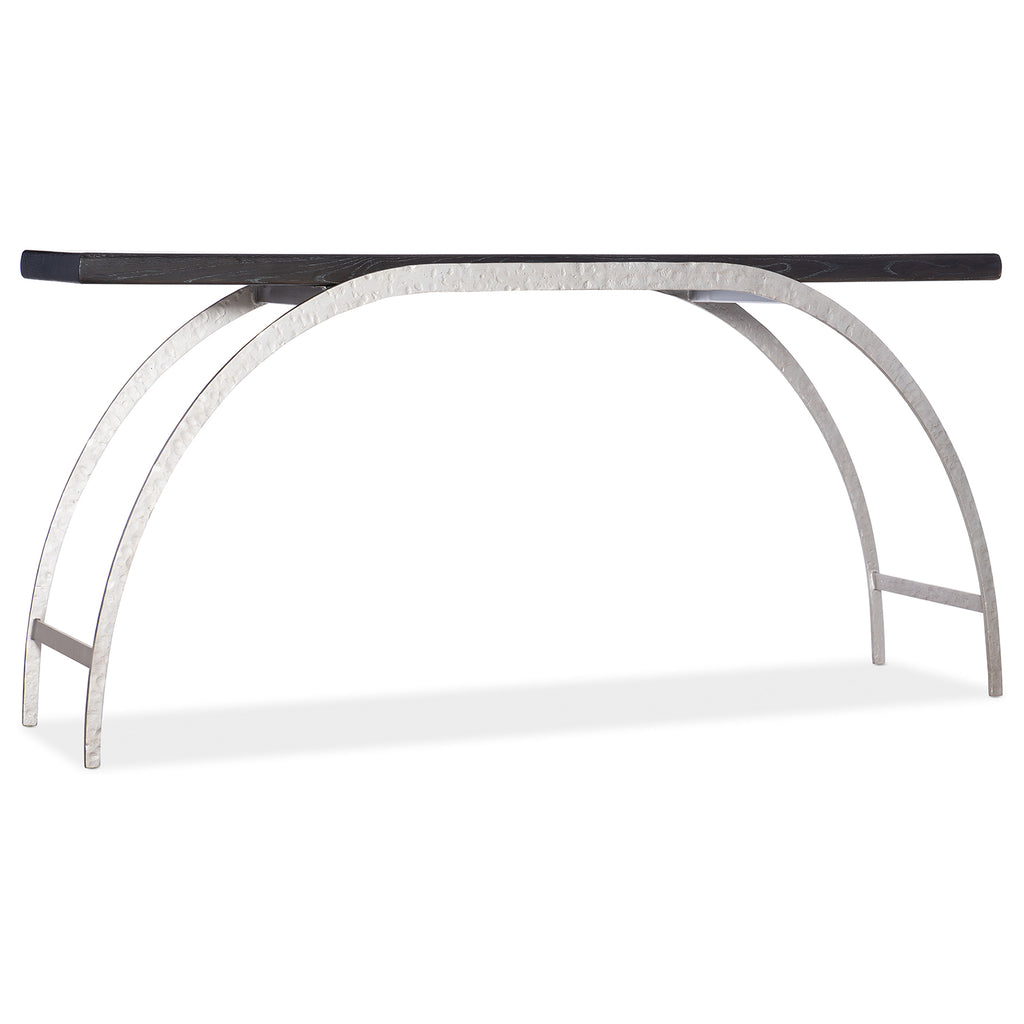 Infused with grace and energy, the Commerce & Market Metal and Wood Console combines a rustic Oak Veneer top in a black finish with an arched metal base in a silver finish.