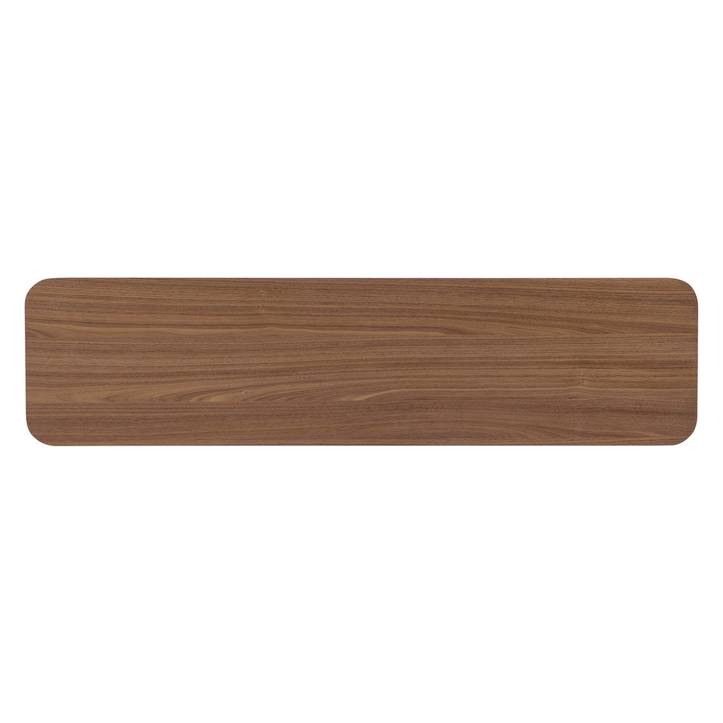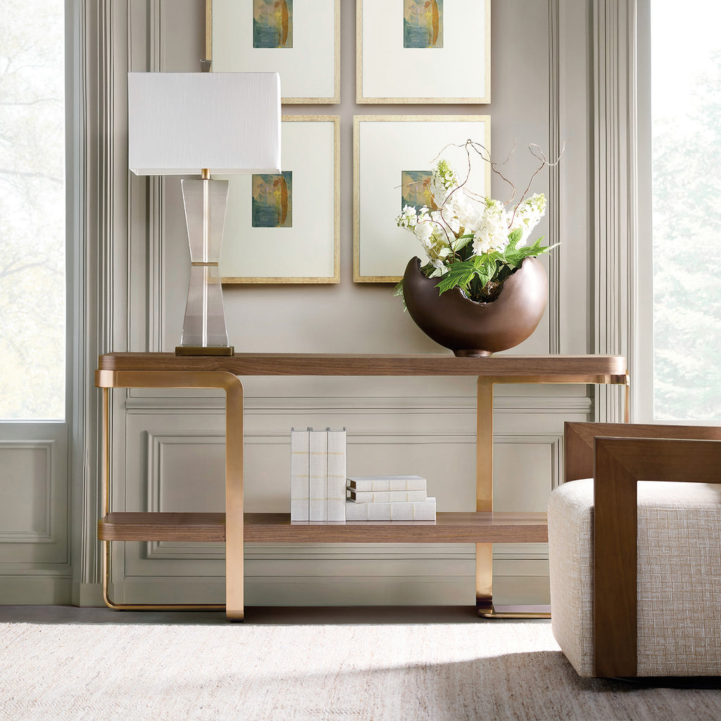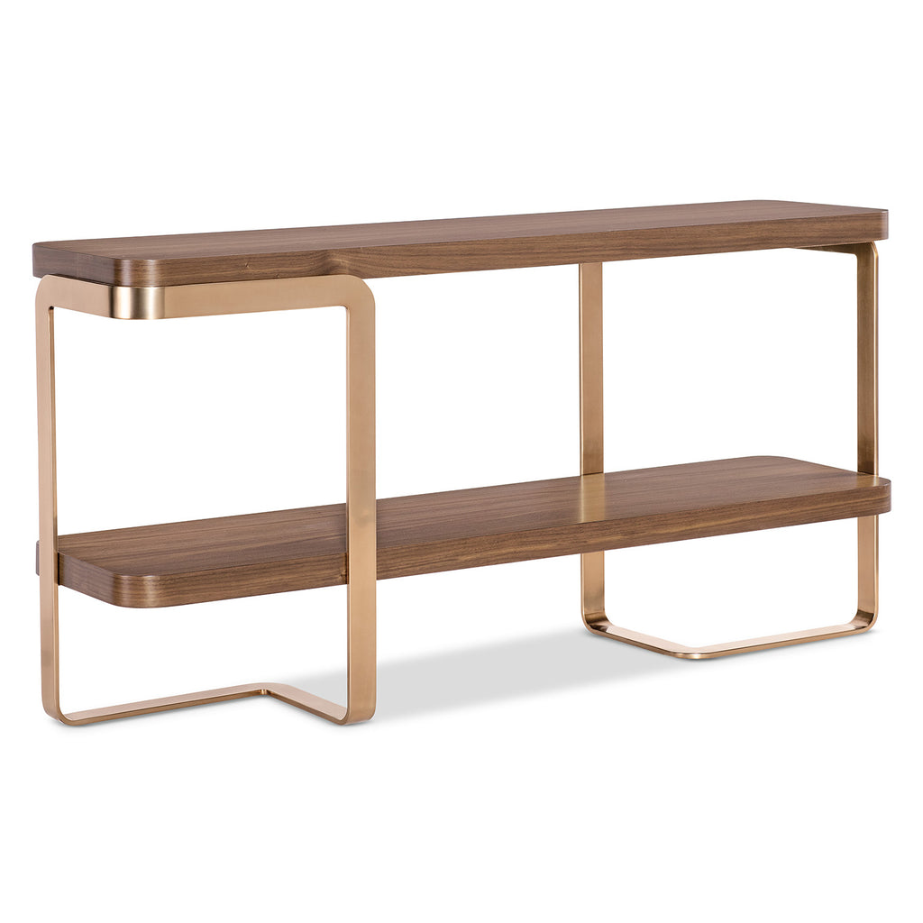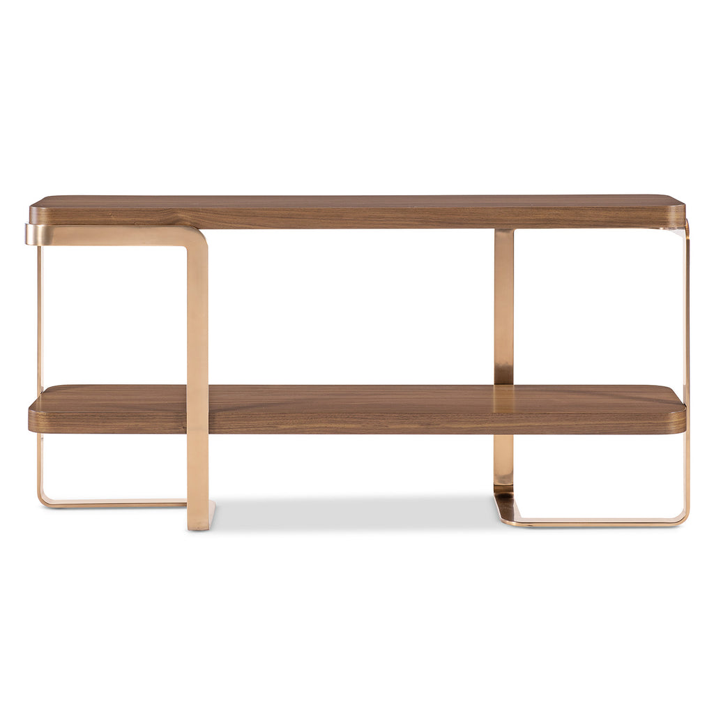 Sleek and versatile, the Eleana Console Table pairs Light Caramel walnut veneers with a plated Sunlit Bronze metal base in a bent-metal design. The softly rounded rectangular top and one fixed wood shelf offer both style and storage, making this table an ideal accent for transitional spaces. Marrying sculptural refinement with an effortless sense of luxury, the Eleana collection is a masterclass in contemporary elegance. The series, imbued with an effortless sense of sophistication, where sculptural silhouettes meet richly textured materials to create pieces that feel at once timeless and of the moment. Versatile in both scale and sensibility, Eleana's thoughtful proportions and nuanced finishes bring a sense of depth and harmony, lending itself seamlessly to a range of interiors, from intimate city dwellings to expansive retreats. Infused with a relaxed yet polished sensibility, Eleana embodies the essence of modern living; stylish, inviting, and intuitively crafted for the way we live today.