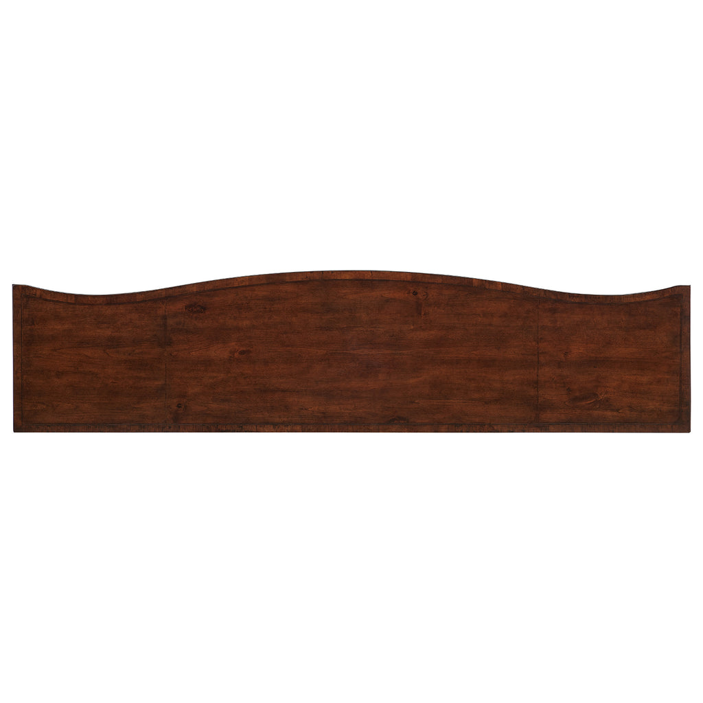 Honor the majestic beauty of the Federal and Georgian design period with the heirloom-quality Charleston Console Table. Featuring thin tapered legs, a curved case front and walnut inlay border on the top and door and drawer fronts, the table has two doors with soft-close hinges and one center drawer with self-close drawer guides. Crafted of Cherry Veneers and Walnut Inlay, it is finished in Maraschino Cherry using natural grain Cherry Veneers showcasing dramatic cathedral patterns in the wood. The pendant and round pulls are finished in an antique bronze color.