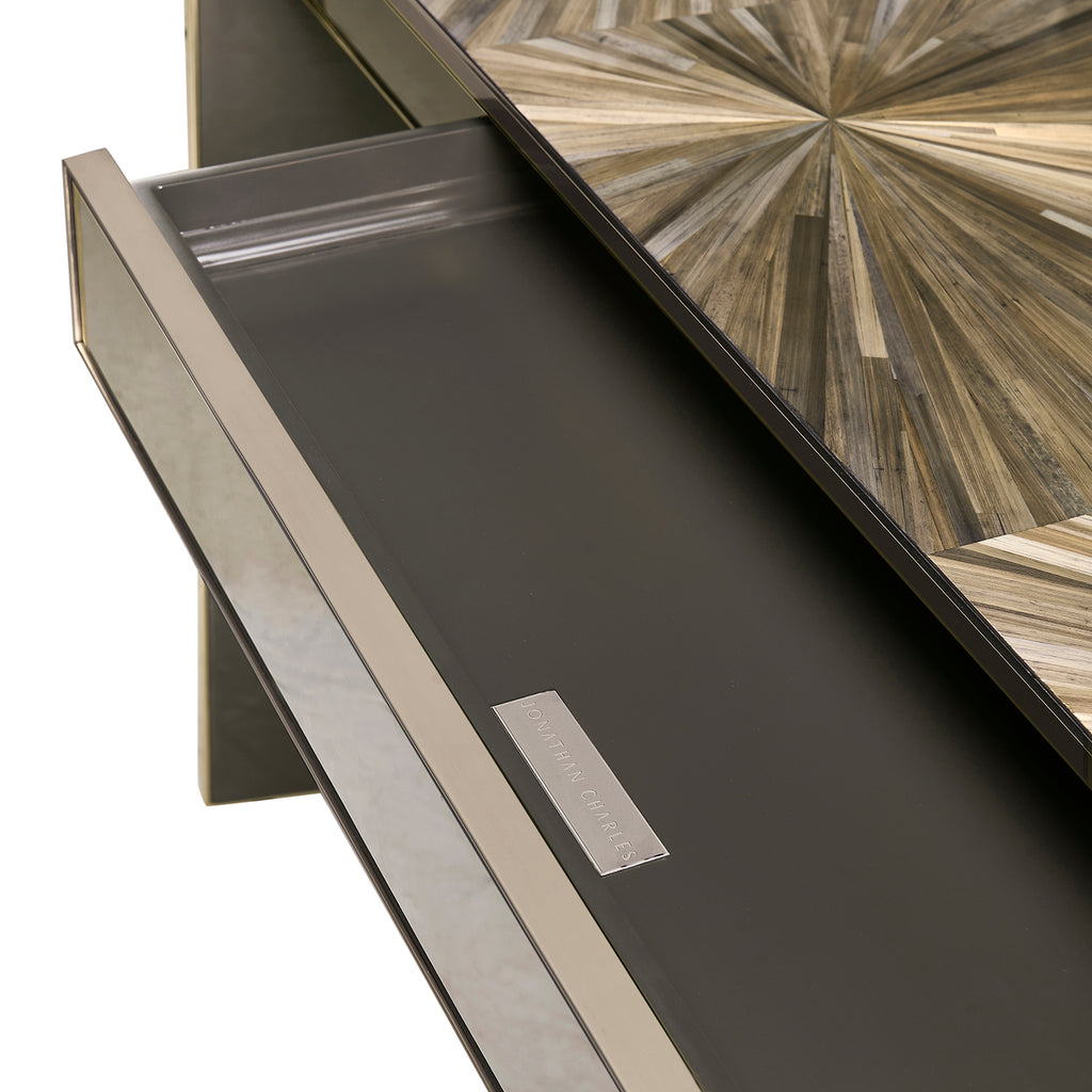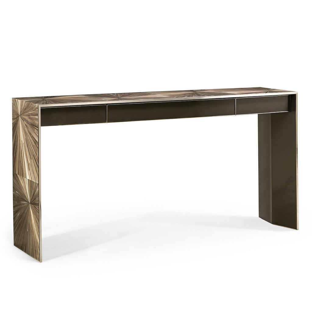 The Terra Console Table is a stunning display of craftsmanship and design, featuring intricate straw marquetry in beautiful natural brown tones. Hand-applied across the entire top, the marquetry creates a mesmerizing pattern, enhanced by a high-gloss finish that highlights its organic texture. The table also includes a discreet single drawer, providing simple storage for everyday essentials. Its base features a lacquered black finish on the inside of the legs, adding a subtle yet striking contrast that gives the piece a dimensional, sculptural feel. With its seamless blend of natural beauty, functional storage, and contemporary elegance, the Terra Console Table makes a refined statement in any entryway or living space.