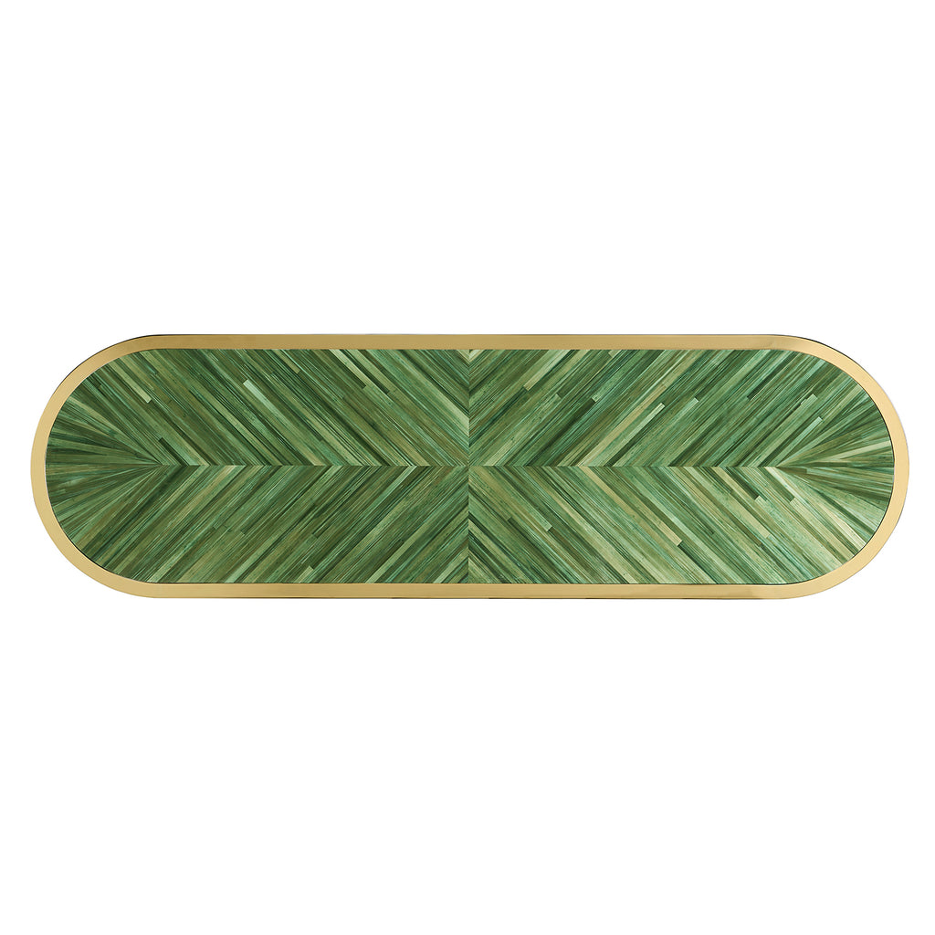 The Verdure Console Table is a masterful blend of luxury and artistry, seamlessly combining rare wood with the delicate craft of straw marquetry. The base is strikingly crafted from Ziricote, a distinctive wood celebrated for its rich palette of black, grey, and white tones. Complementing this striking base is a hand-laid straw marquetry top in a radiant green hue arranged in a starburst pattern.