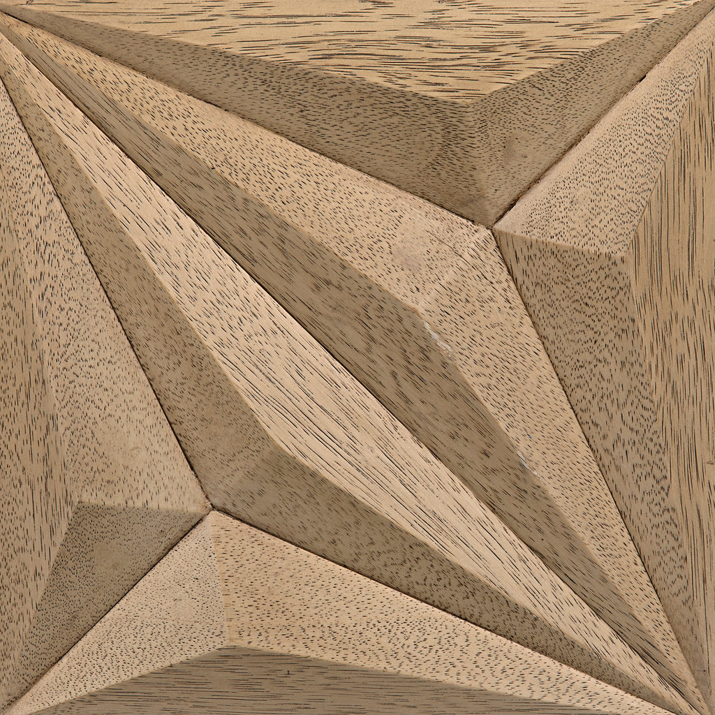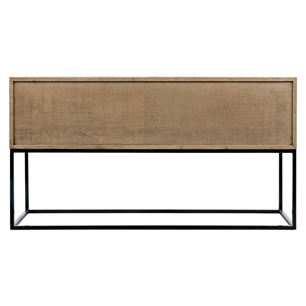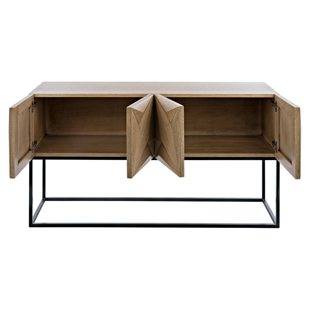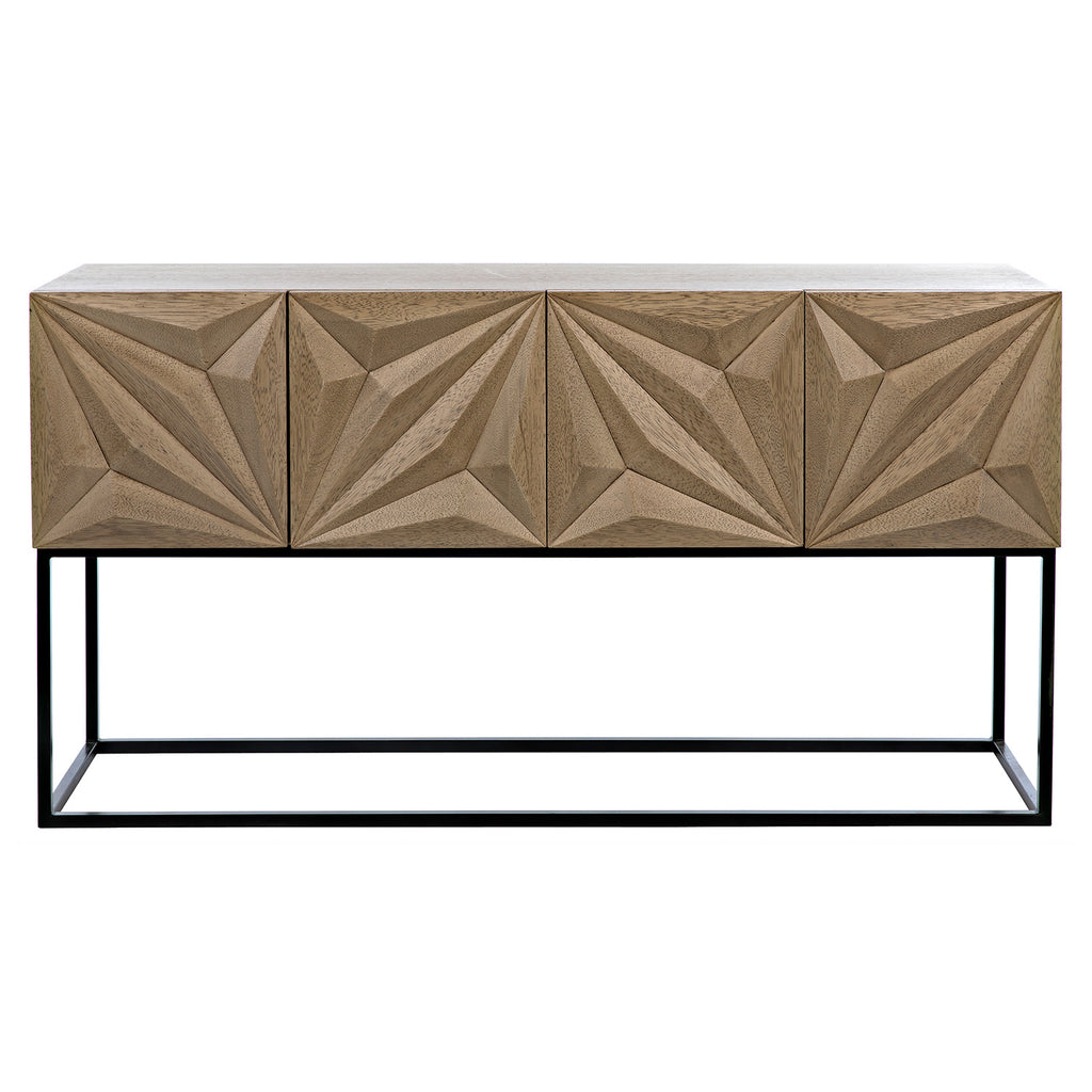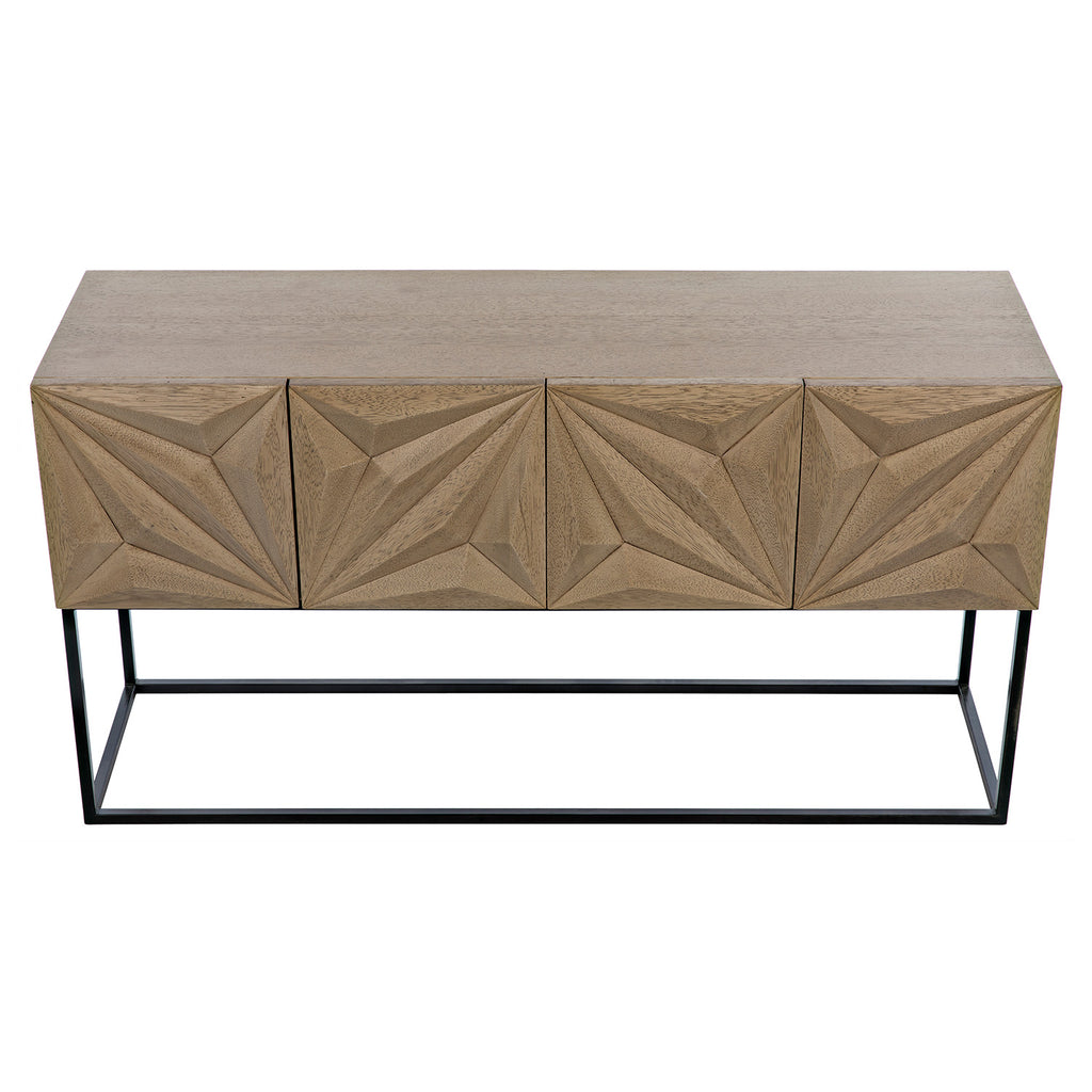 An excellent addition to a foyer or hallway, this Noir console table delights with contemporary flair. Simple yet chic, this functional furnishing adds dimensional depth to any space. Stunning in its simplicity, this solid walnut console rests atop slim metal legs. Each of its four doors is beautifully hand-carved with bold diamond and rhombus patterns. Open, they reveal generous interior storage.
