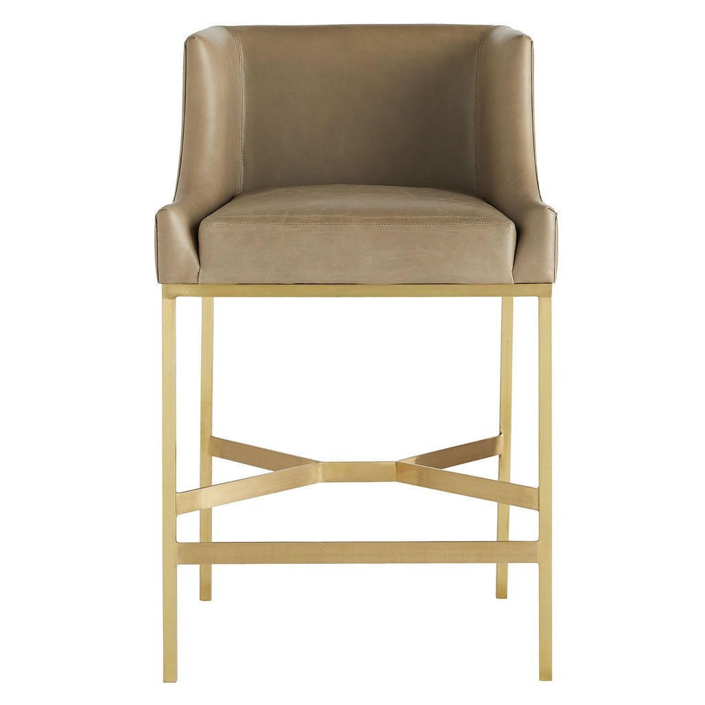 Covered in soft morel leather, this stool features a squared back with graceful curved arms flowing into an antique brass linear base—ideal for both traditional and modern spaces—finish and leather will vary.