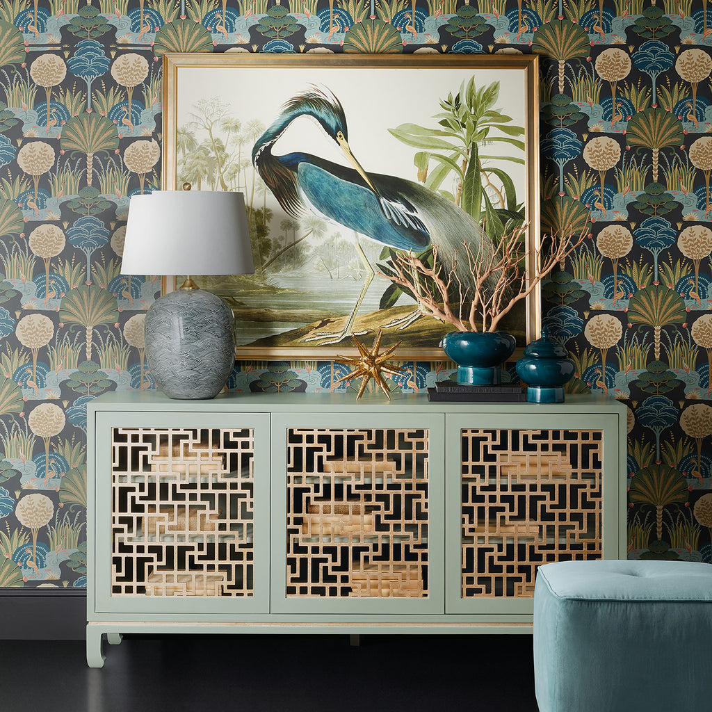A light and airy garden gets a dash of Asian flavor in the Trellis Entertainment Credenza. Crafted of Maple Veneers and Silver Leaf, the exterior is painted light green with champagne-colored open fretwork, accent trim and a chow leg style. each of the three doors with soft-close hinges and touch latches are two adjustable wood shelves and wire management. Accommodates up to a 70-inch TV.