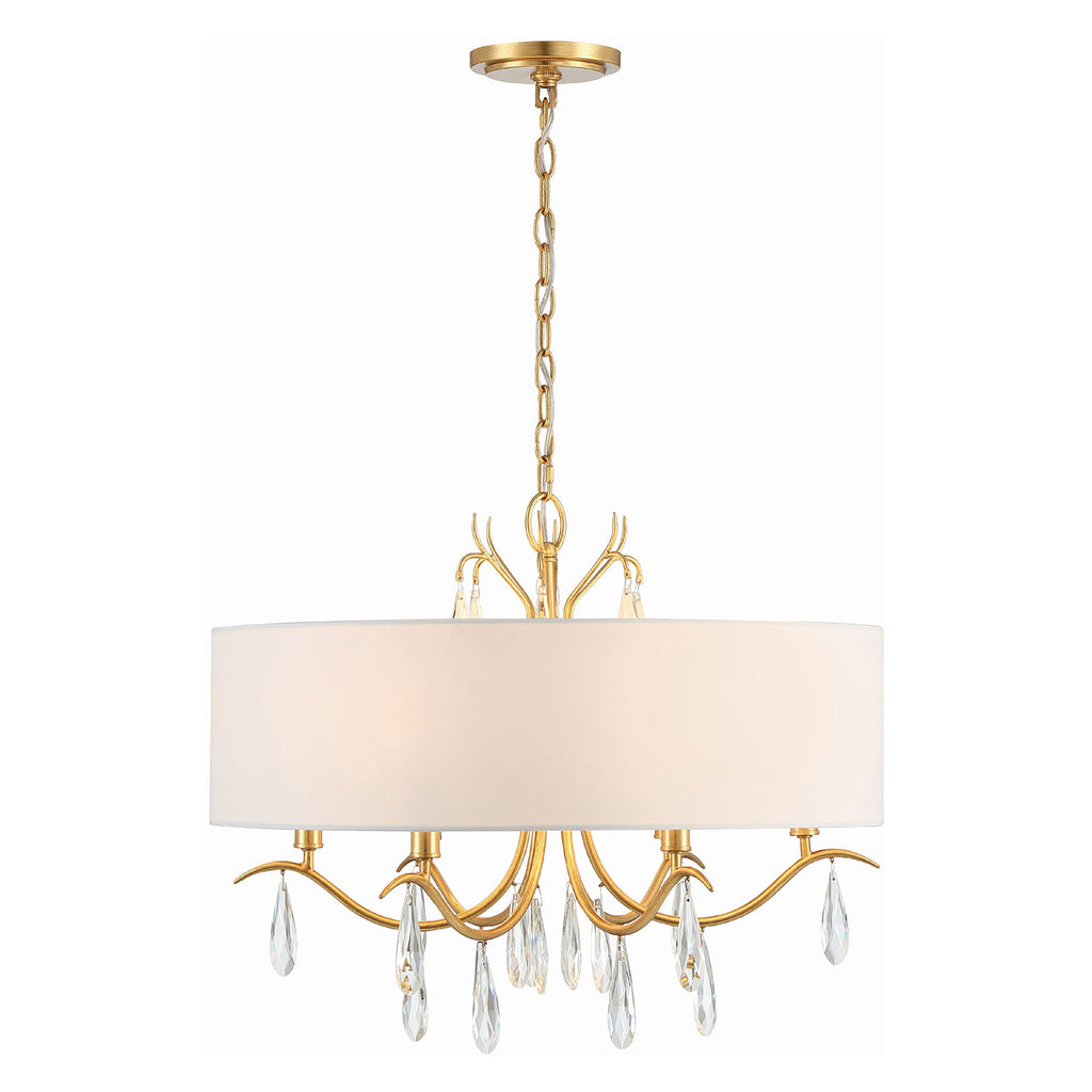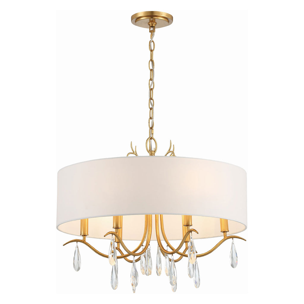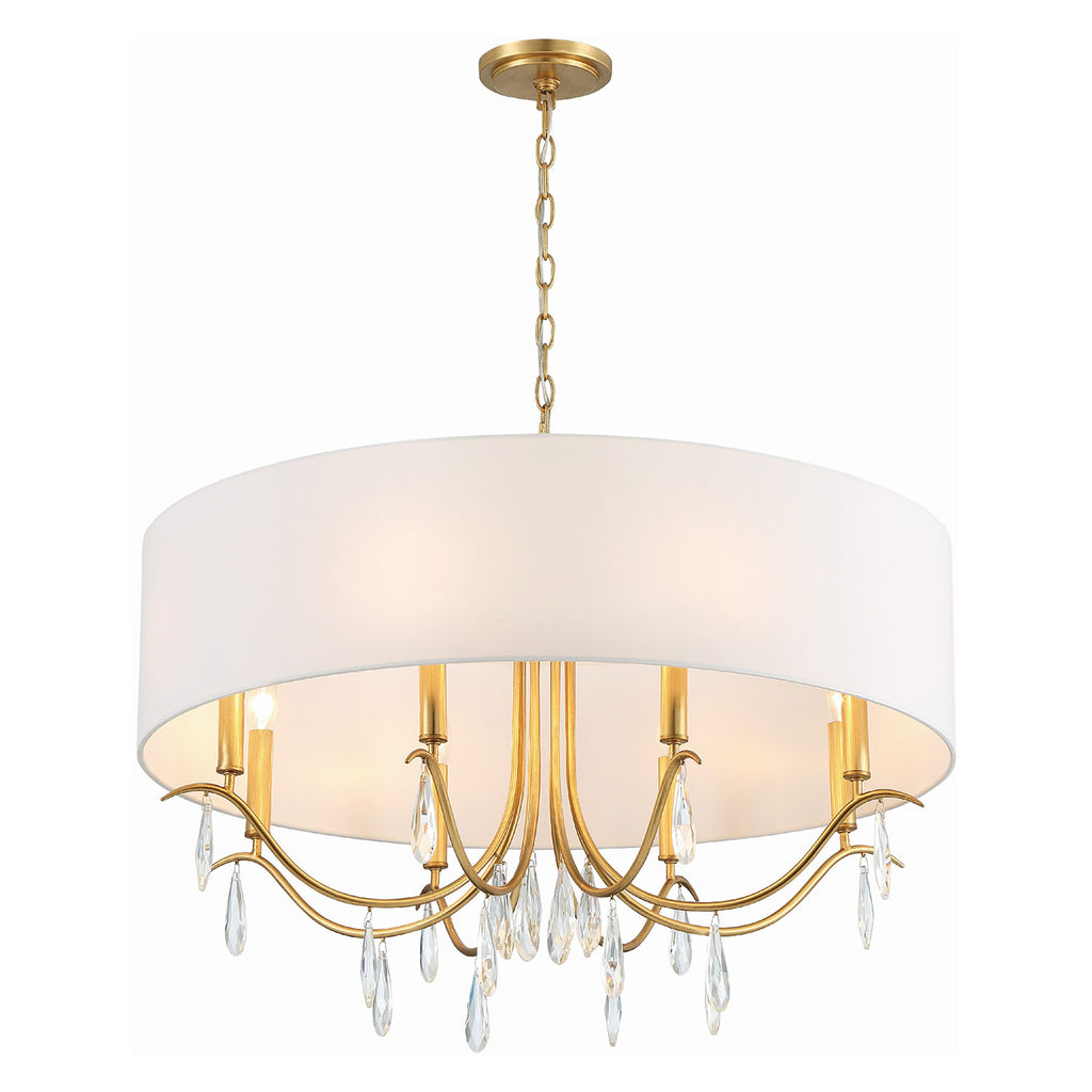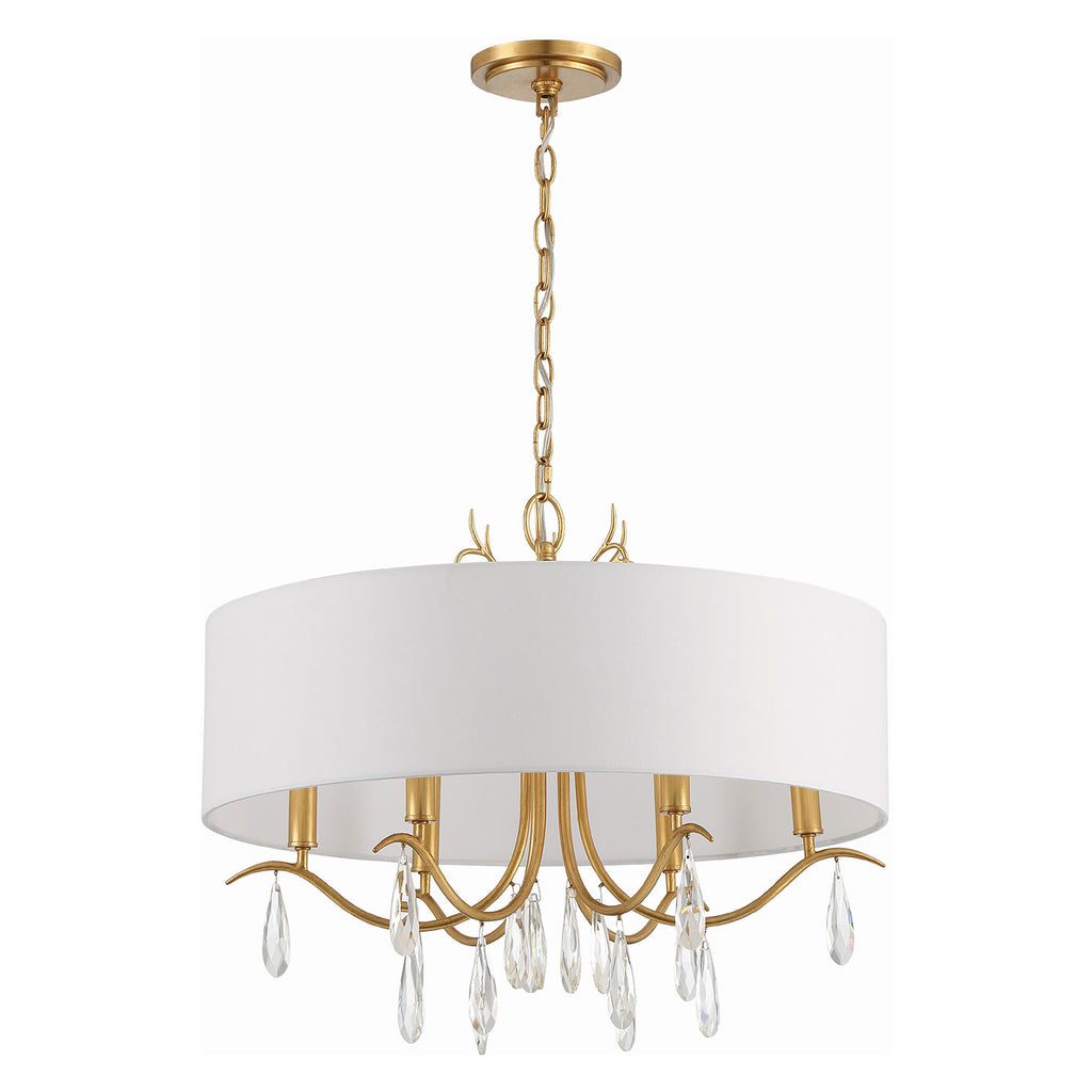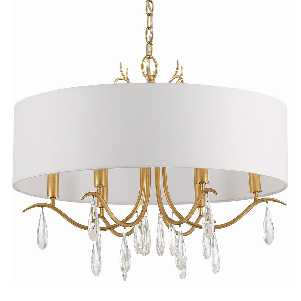 Crystorama is known for its standout lighting, which is exceptional in quality and design. From traditional all-crystal designs to transitional lighting collections, Crystorama offers styles that will match any décor and are always in fashion. Rollins drum chandelier is a classic design versatile to fit traditional and modern settings. A large white round silk shade beautifully contrasts its Antique Gold finish. The organic inner metal frame features swopping arms and elongated crystal drops. This elegant collection provides an elevated and timeless look to an interior setting. Rollins collection features a versatile transitional design. A marriage of traditional and contemporary equate a classic and timeless design that focuses on simplicity and sophistication. White silk shade drum dressed with elongated crystal gems. Antique Gold metal finish is a popular choice with homeowners. The finish has a rich color and texture with warm undertones.