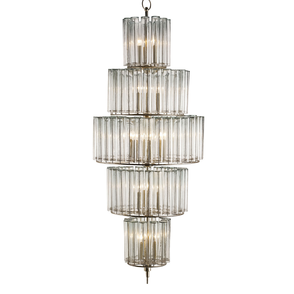 The large version of our Bevilacqua Chandelier is a magnificent toast to good taste. Filled with luminosity and grace, its five tiers of reflective glass flutes are made from recycled bud vases. Its wrought iron frame is finished in an exquisite silver leaf that compliments the hues in the glass. This 18-light chandelier with its ascending and descending architecture is one in a variety of fixtures in the Bevilacqua collection.