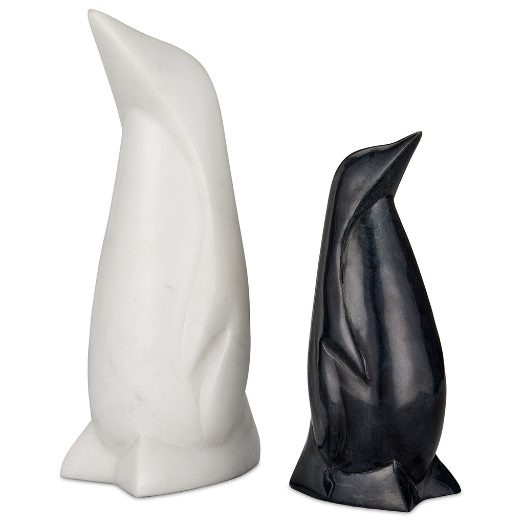 The ultra-contemporary lines on each of the Currey & Co Black & White Penguin sculptures create pared-down profiles that have just as much personality as the marine birds. As whimsical as they are modern, the black and white sculptures are carved from soapstone and honed to a smoothness that creates a nice sheen. The surfaces of the objects will vary from piece to piec,e given the sculptures are made of natural stone.