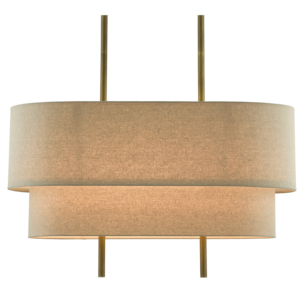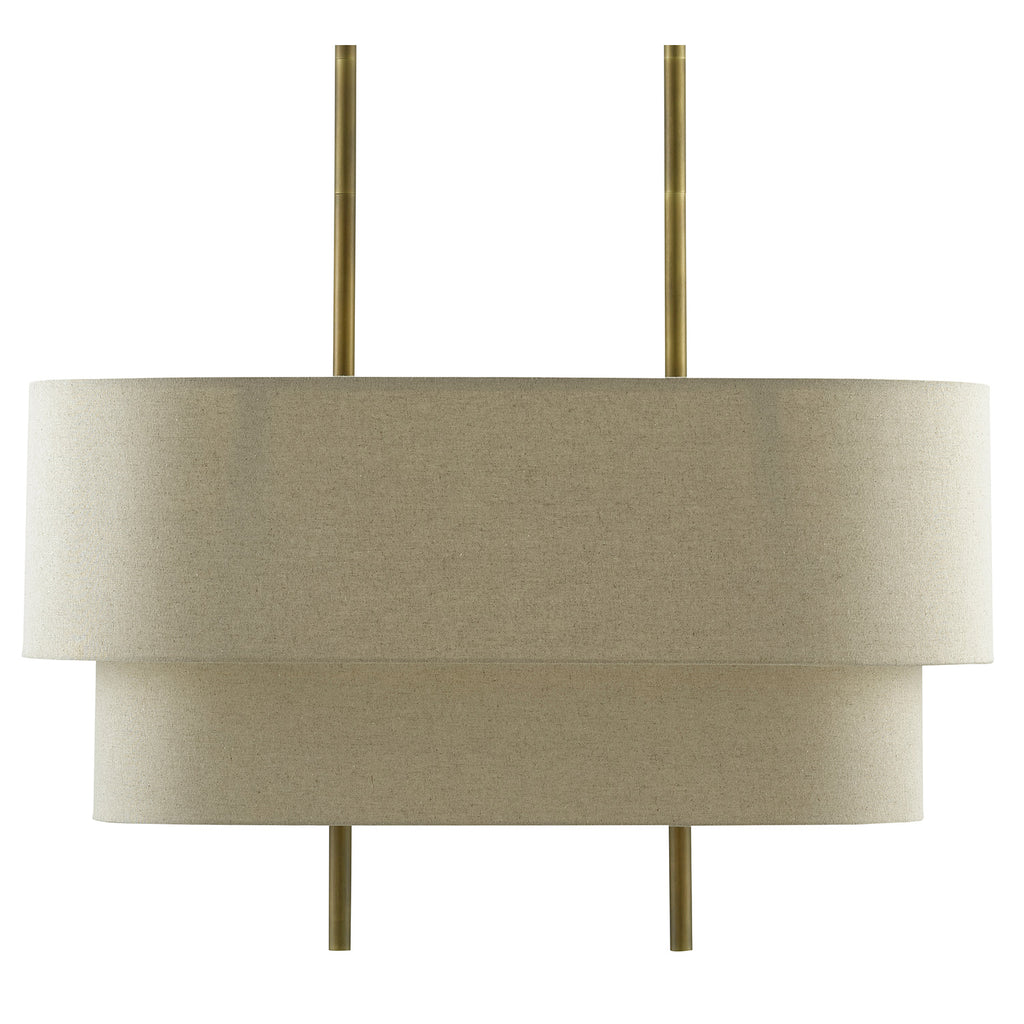 A study in simplicity, the Currey & Company Combermere Rectangular Chandelier has a pared-down profile that makes it one of our most versatile designs. Made of metal in an antique brass finish, the gold chandelier has stacked shades made of linen.