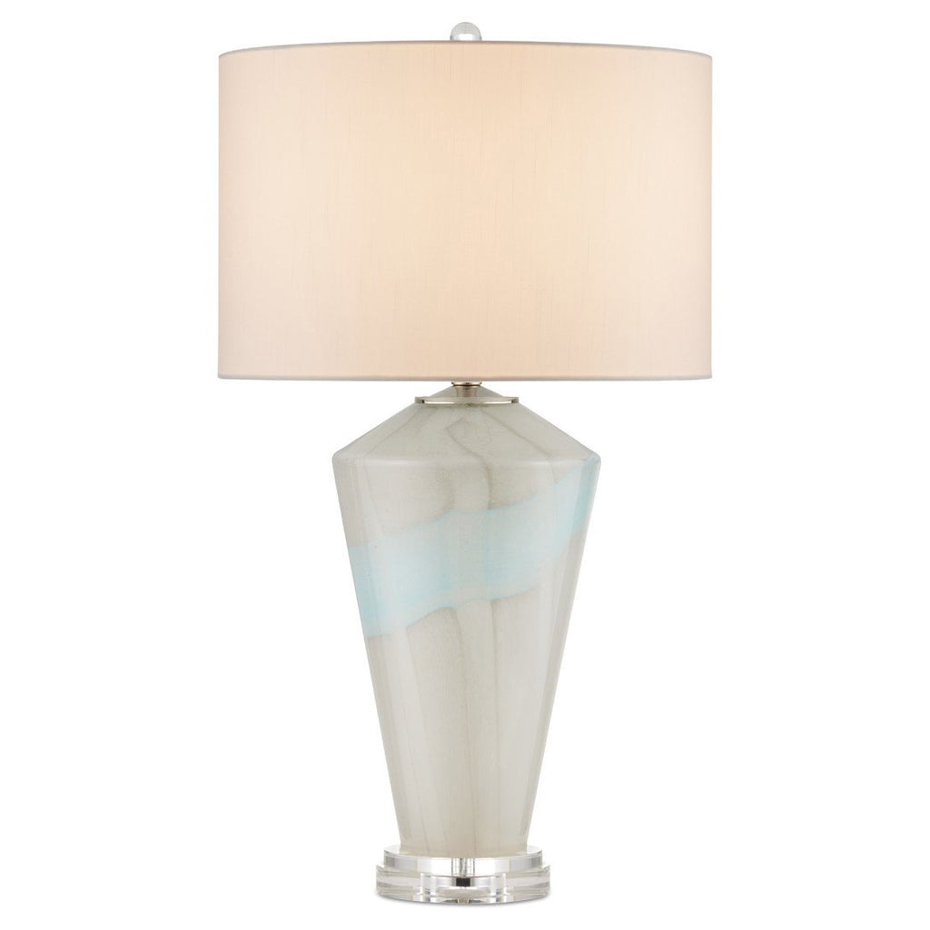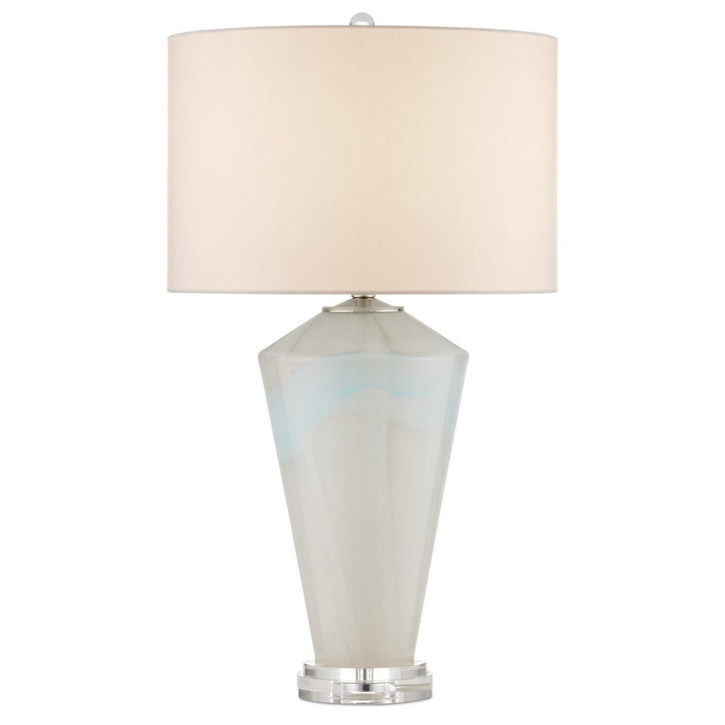 The Floating Cloud Table Lamp is made of glinting mouth-blown glass. This white table lamp with drifts of pale blue on its surface was created by a very sophisticated process that involves two artisans working together—one blowing the pastel gray textured glass while a second pours white and light-blue texture into the molten material. The body is then fitted to an equally ethereal optic crystal base and accentuated with hardware in a polished nickel finish. Because these are artisanal pieces, each one will be unique.