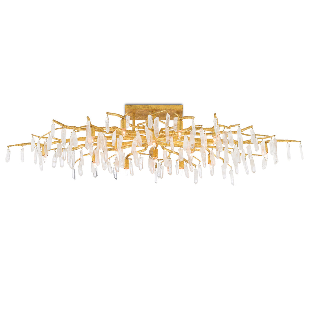 The gold version of the Currey & Co Forest Light Semi-Flush is a truly exceptional work of art fanning out from its center to reach 60 inches in diameter. Place this object art in a room and it will become a stunning sculptural piece dripping with quartz crystals. The washed Lucerne gold finish is a perfect complement to the quartz on this piece that echoes nature with its tree-like branches.