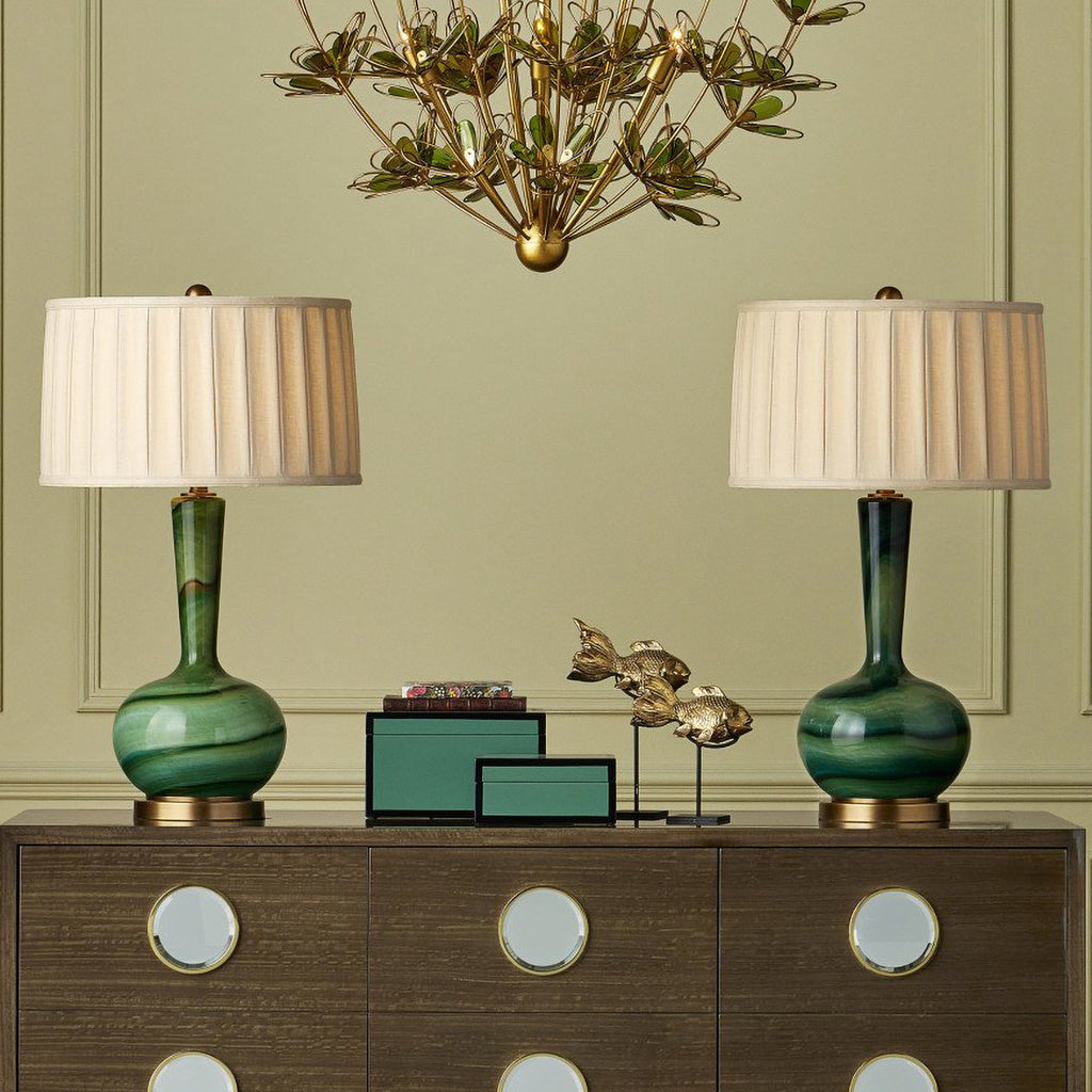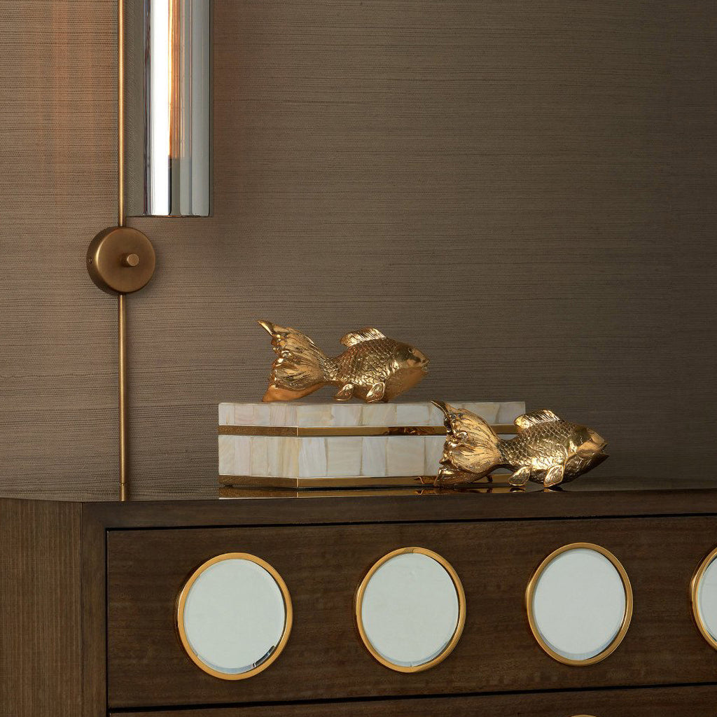 The Goldfish Set of sculptures is a pair of sturdy decorative accessories that can be placed on a table or on their included stands. Made of bronze in a gold polish finish, the fish, symbols of wealth and good fortune in some cultures, have a beautiful fluidity just as they would if they were real and swimming through water.