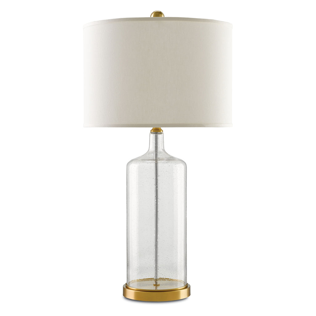 The Hazel Table Lamp with its bottle-shaped body in a marvelous clear seeded glass is the perfect manifestation of tiny bubbles! The metal base, hardware and finial have been treated to a gleaming brass finish to add a touch of warmth to the design. The off-white shade on the lamp that stands 31 inches tall completes a composition of perfect proportions.