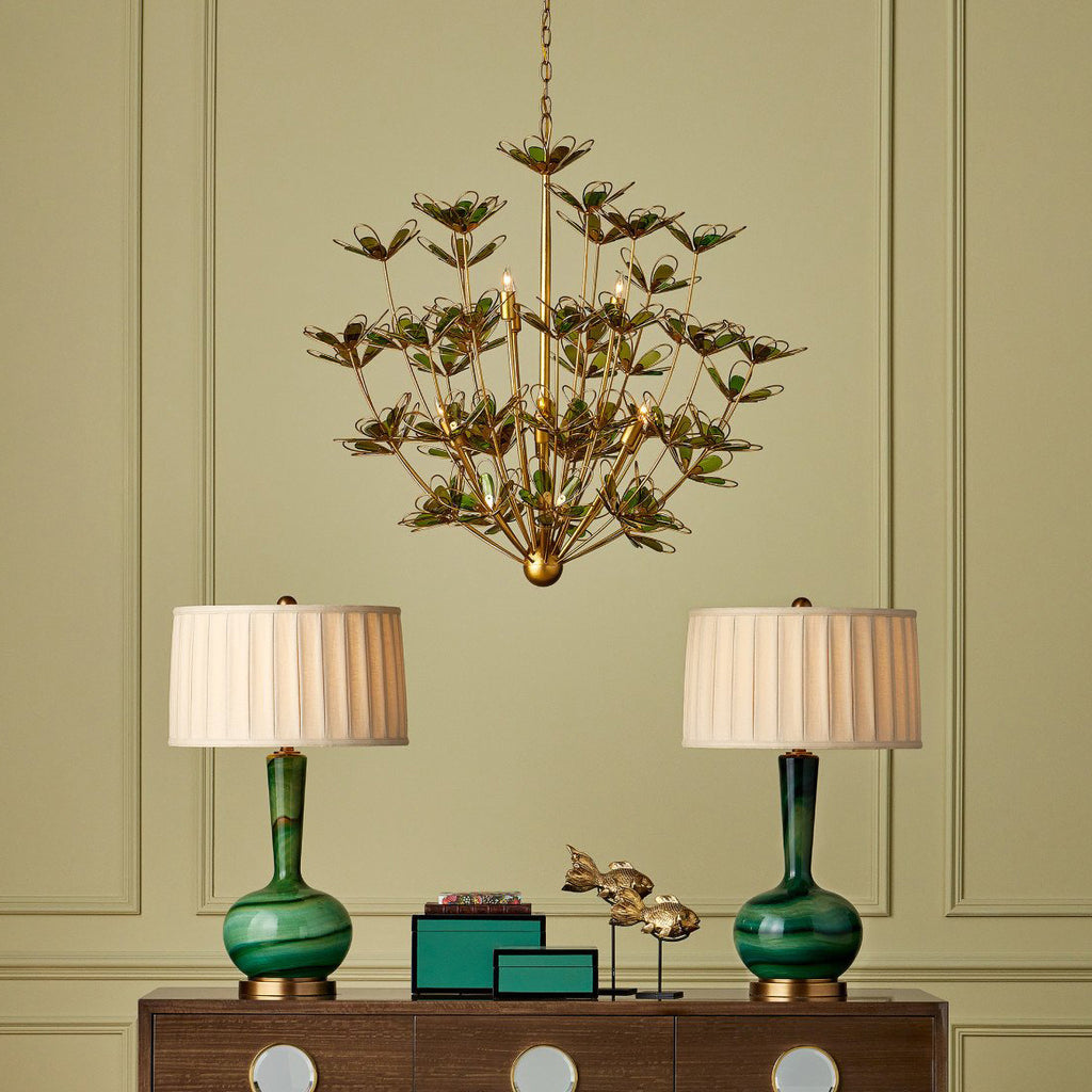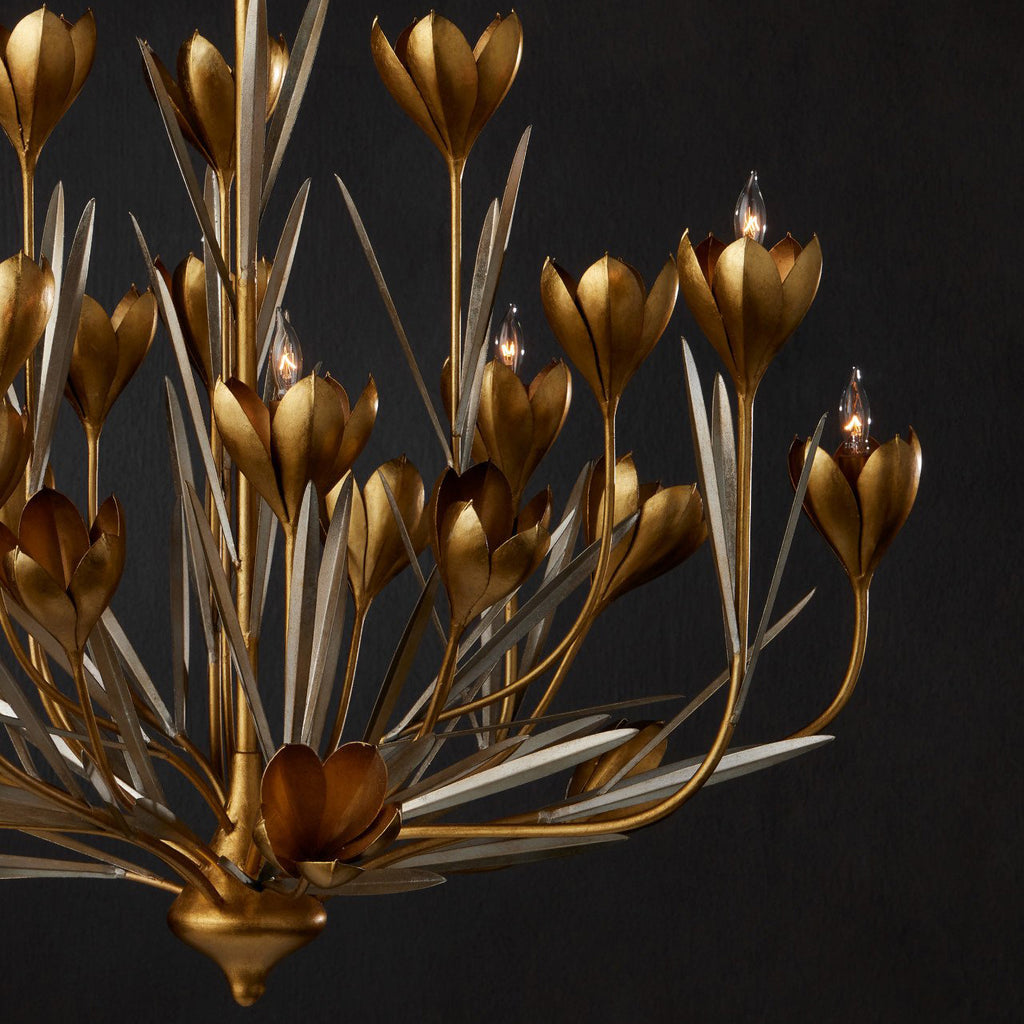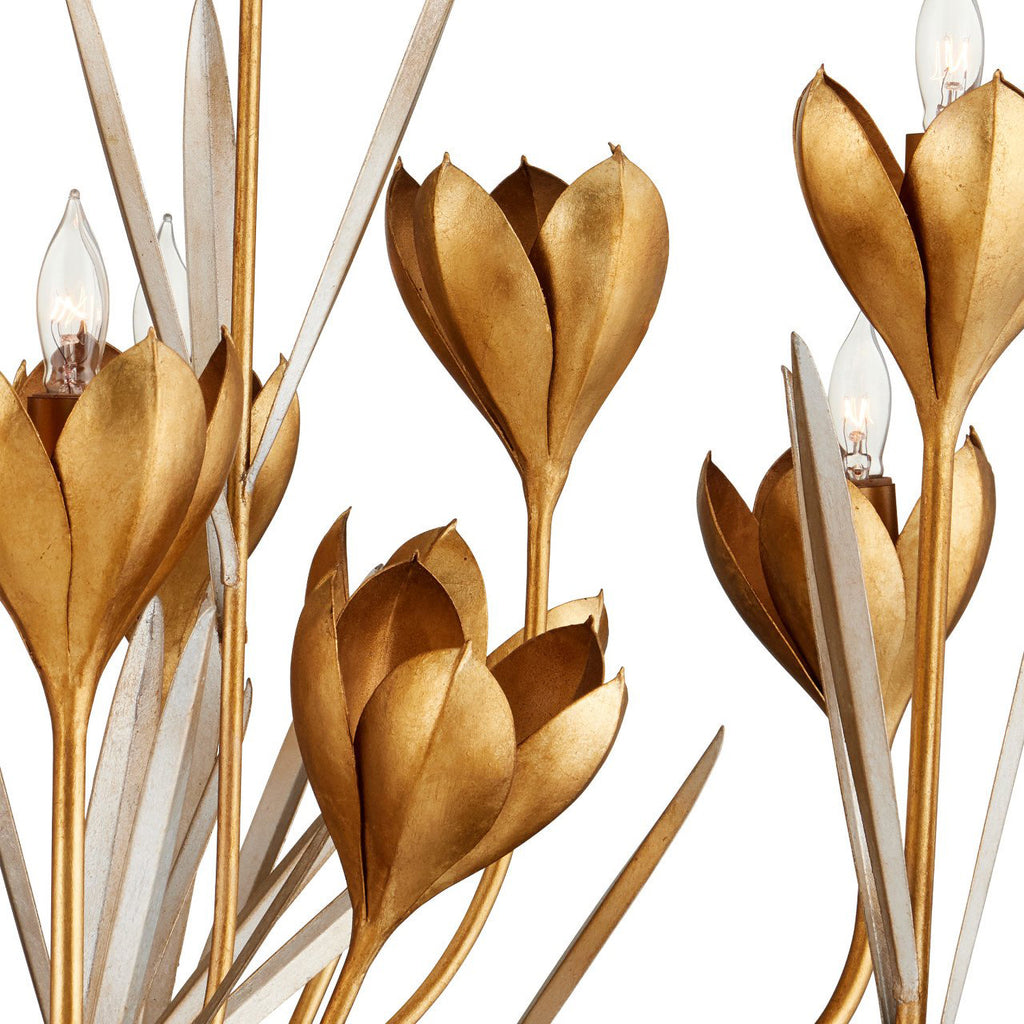 The flowing shape of the Hortensia Chandelier was inspired by the crocus flower, which is evident in how its blossoms open toward the ceiling as if they are growing toward the sun. The blooms and frame of the wrought iron chandelier are covered in a contemporary gold leaf finish while the linear leaves are in a contemporary silver leaf finish for a fanciful contrast.