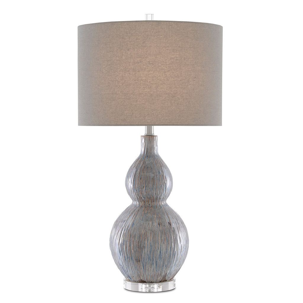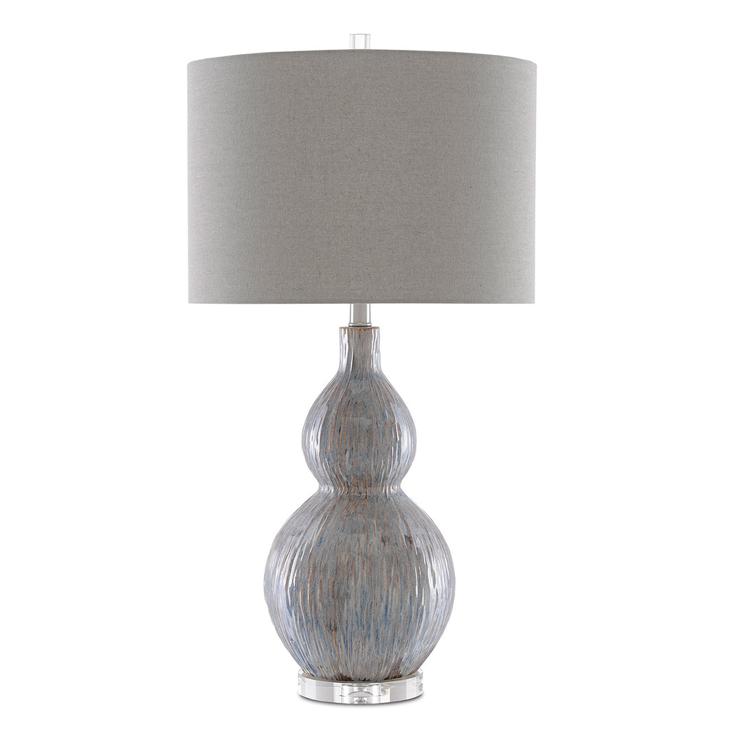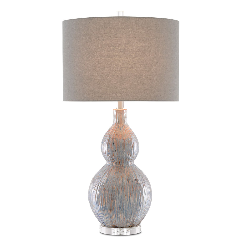 The gourd shape of the Currey & Company Idyll Table Lamp has been realized in porcelain. The striated surface in gray, blue, and taupe tones is texturally rich. The gray lamp sits atop a clear optic crystal base and is fitted with a gray shade.