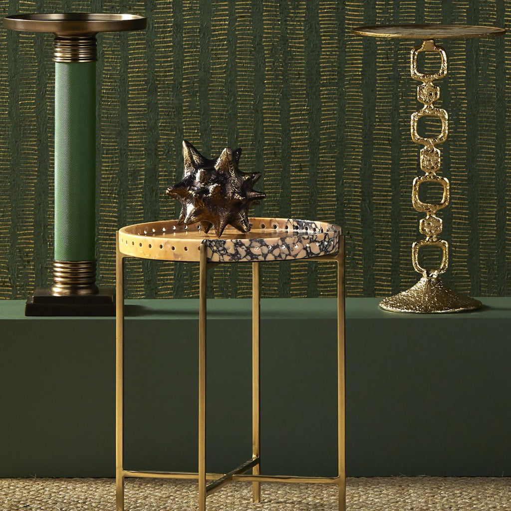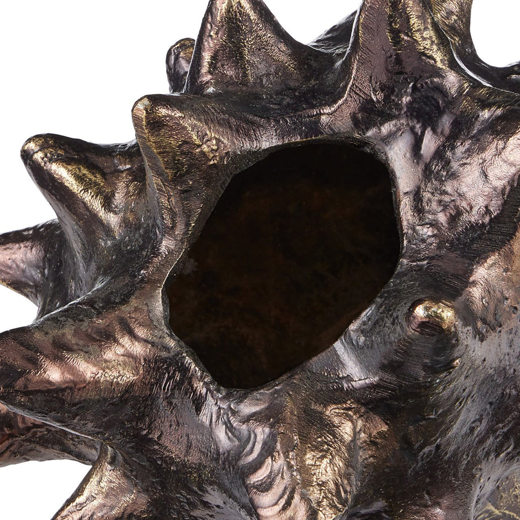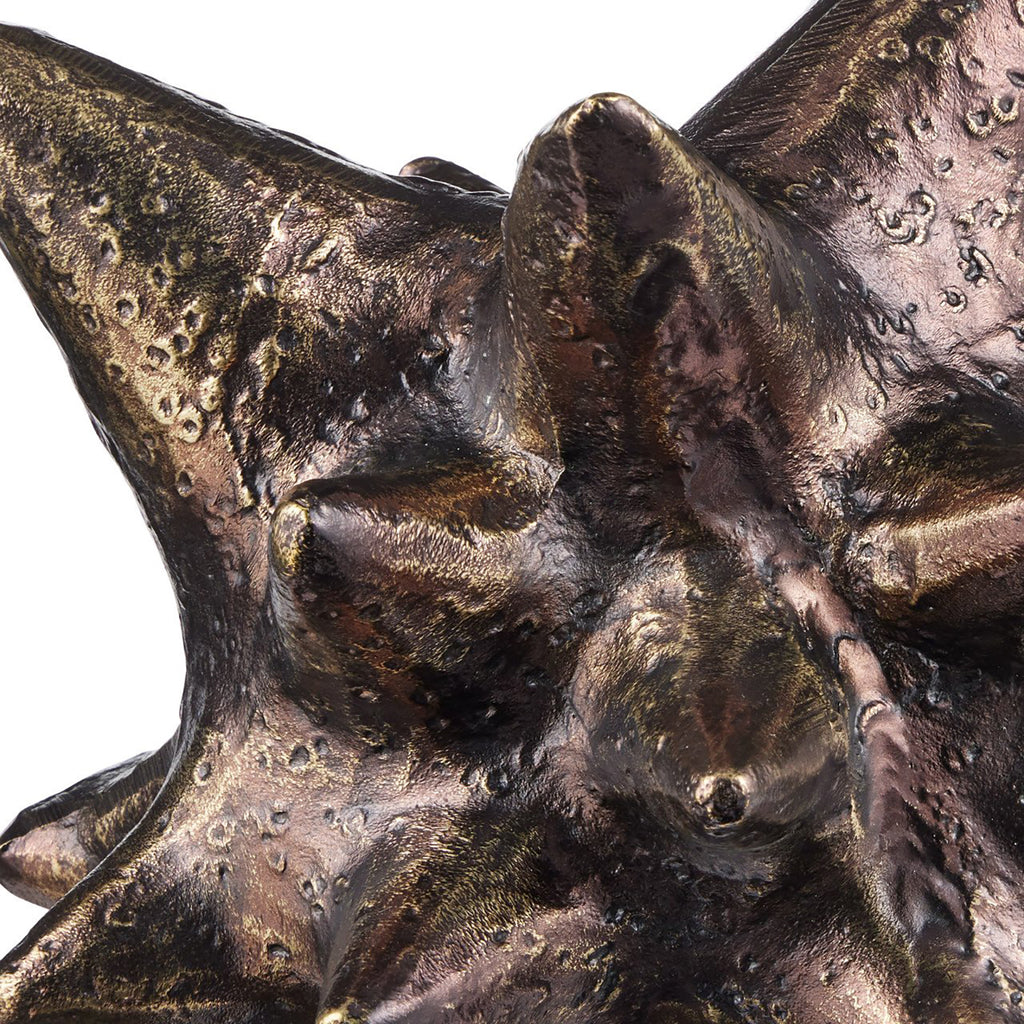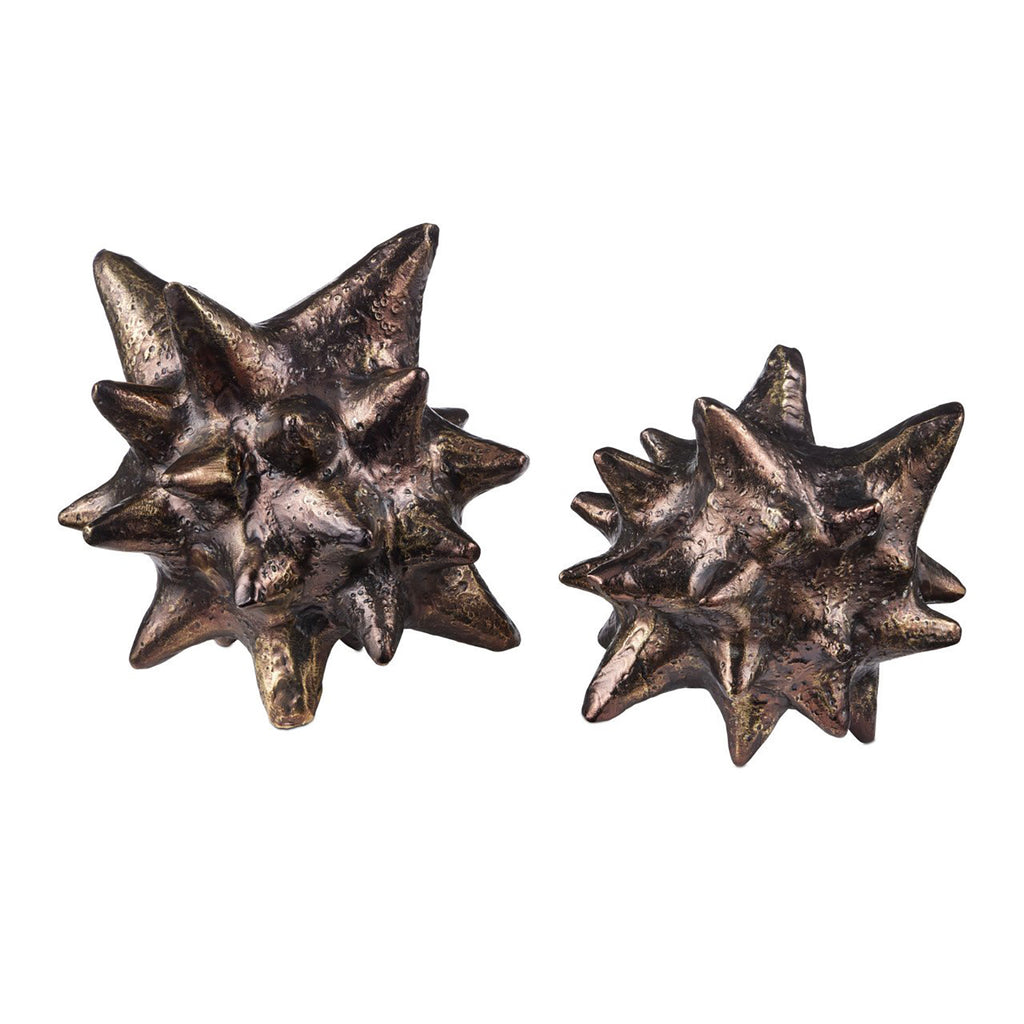 A pair of spiky decorative accessories, the Currey & Co Jacks Object Set includes two cast aluminum sculptures that gleam in an antique brass finish. Once the pieces are pulled from the mold, artisans treat them to the mottled finish that makes them looked aged.