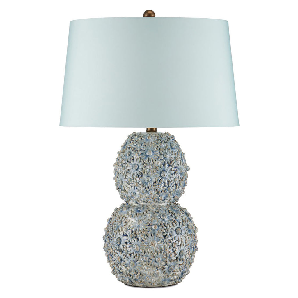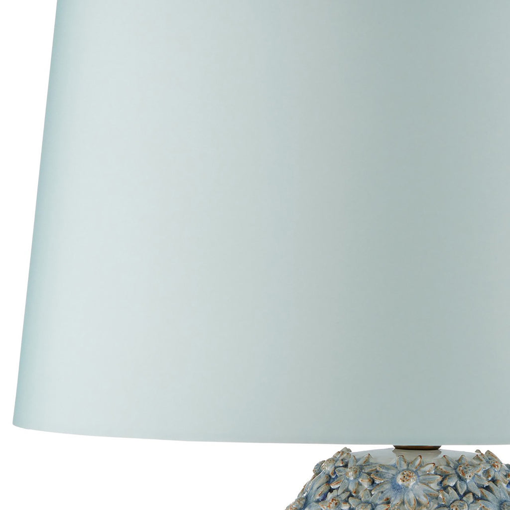 The Currey & Co Jessamine Blue Table Lamp has a surface studded with beautifully fashioned flowers. Rather than apply one type of bloom, a number of floral shapes are intermingled to give the pale blue lamp a charm that is heightened by the top edge that is slightly rounded as it approaches the shade. The handmade character of the piece comes from the fact that each flower is created individually and applied, one-by-one, by hand by community of talented women artisans who live at the border of Burma and Thailand.