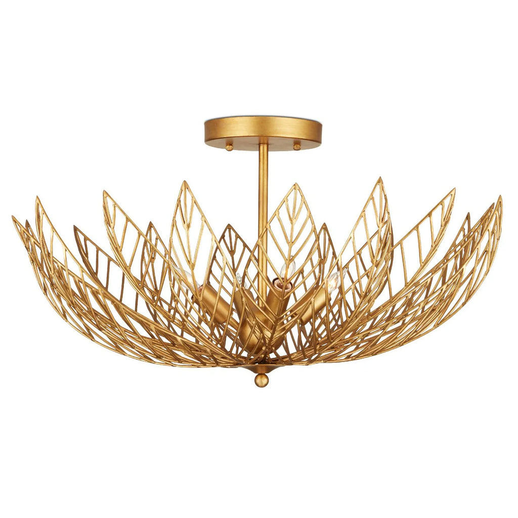 As its name suggests, the Leaflace Semi-Flush Mount has lacy leaves that flow up from a central cog to surround the light-source in an artful way. Made of thin ribs of wrought iron in a contemporary gold leaf finish, the metal is painstakingly welded together to form each shape. The contemporary gold finish on the hardware and frame enlivens the gold semi-flush mount to make it a luminous composition even when the lights are switched off.