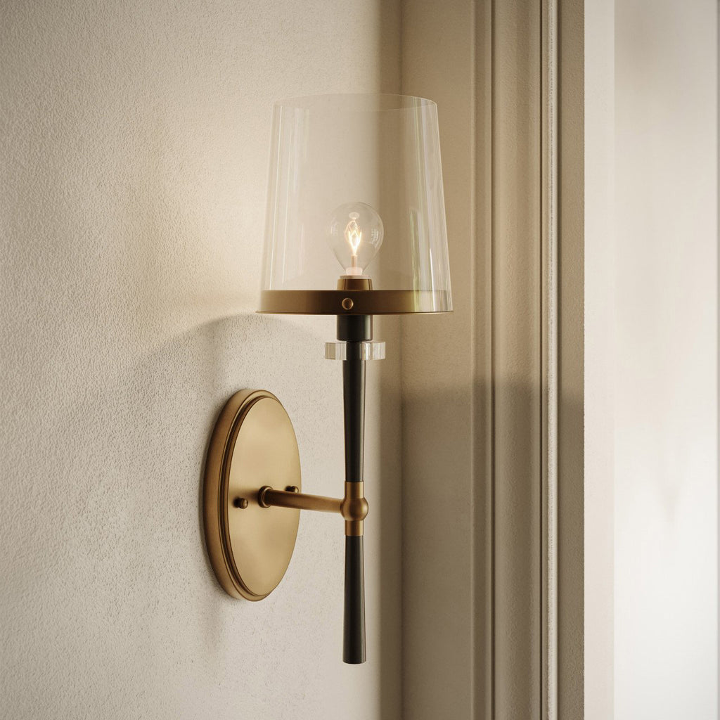 We designed the Lyndall Wall Sconce with simple shapes in mind. The clean feel of the glass shade and the unobtrusive fasteners that affix it to the metal ring, which match the fasteners on the wall-plate, contribute to the appeal. The antique brass finish on the top ring and wall-plate contrast the oil-rubbed bronze on the stem, which has several stylish accents: an optic crystal disc just before it meets the shade and a geometric fitting at its narrowing center.