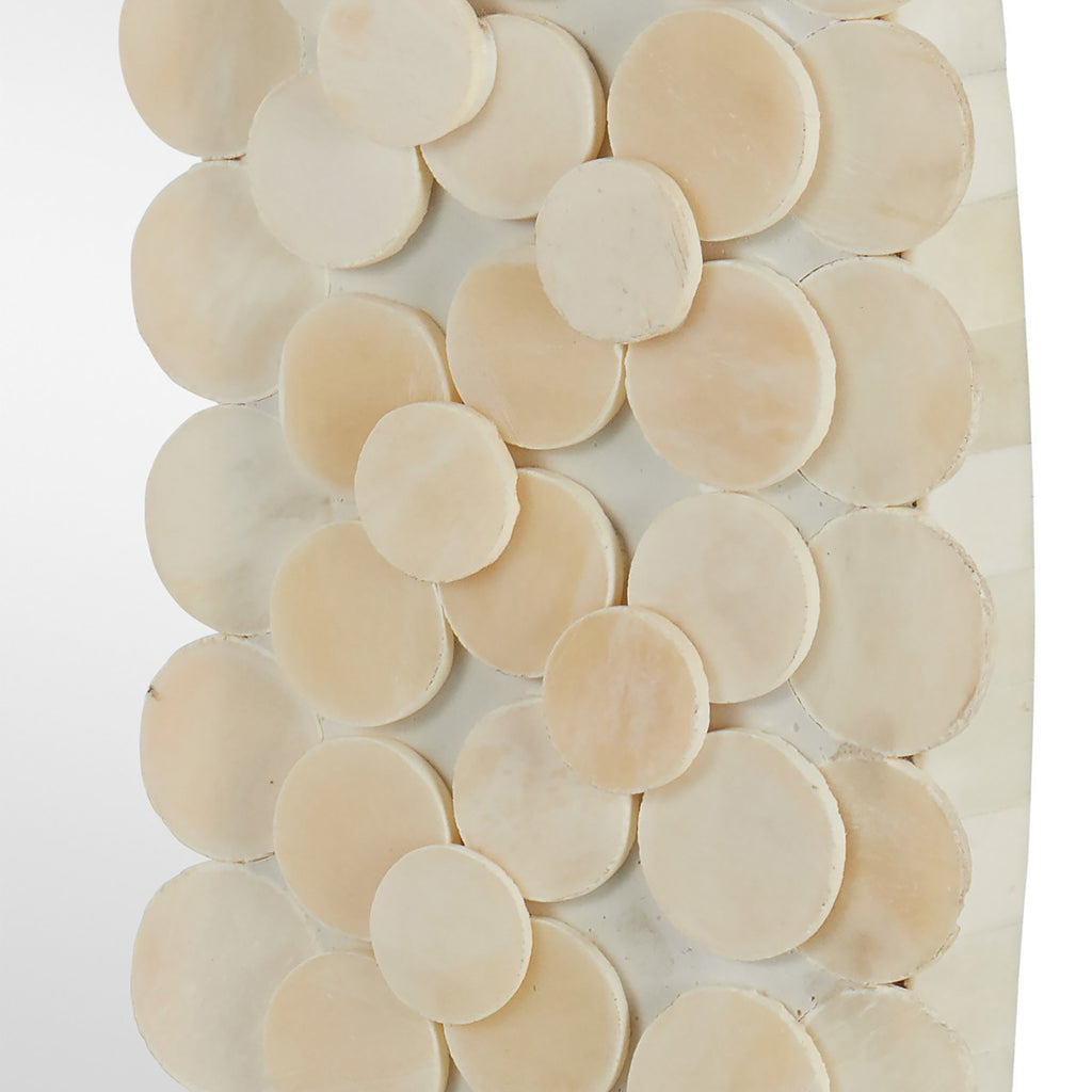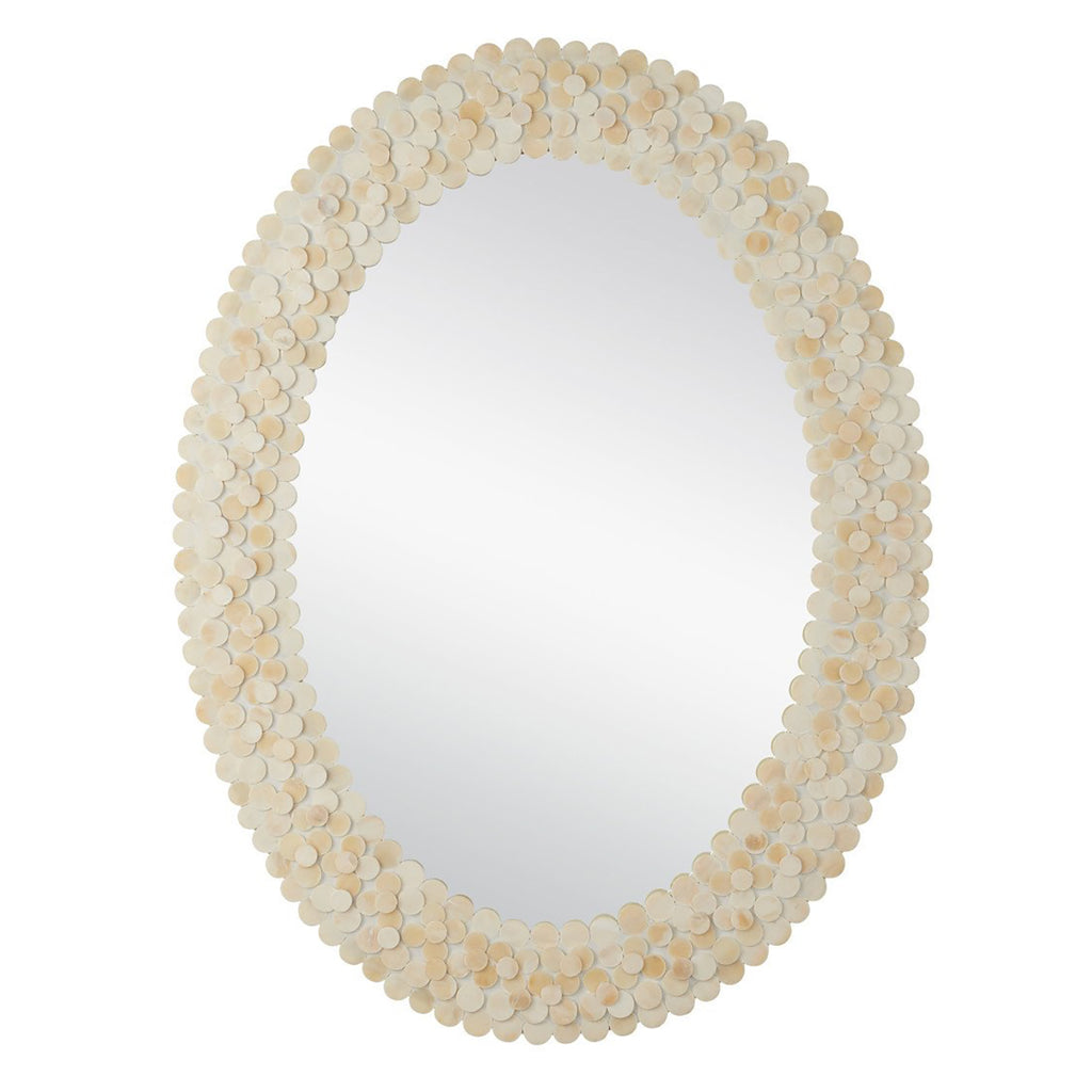 The Currey & Co Merriam Oval Mirror has an lovely frame fitted with over 200 hand-ground buffalo-bone discs. The color variations in the delicate bone bring this ivory decorative mirror a textural interest, while the painstaking placement of the circlets brings it a sophisticated feel. There is no bevel on the mirror.
