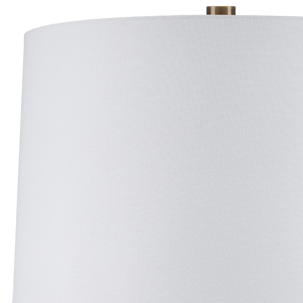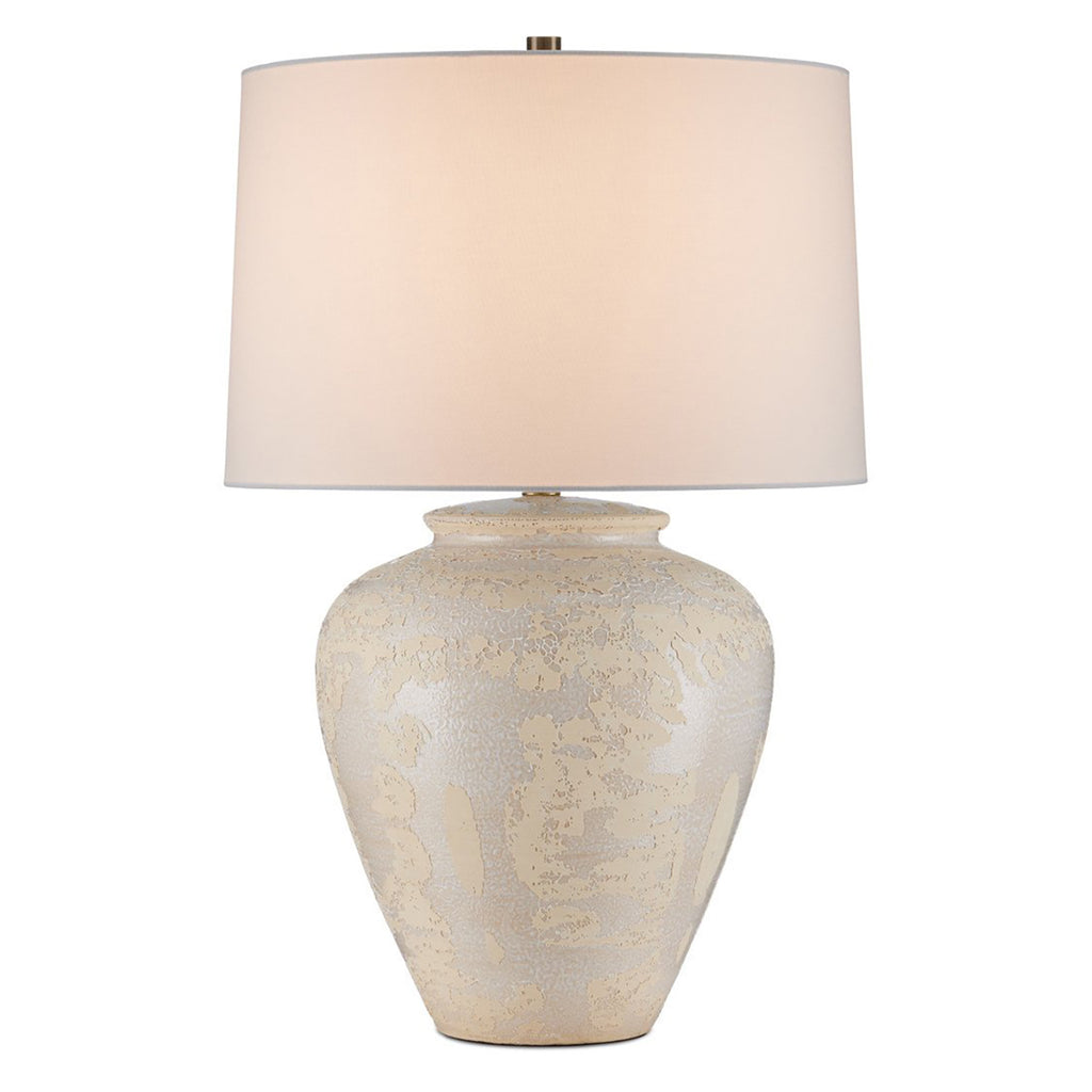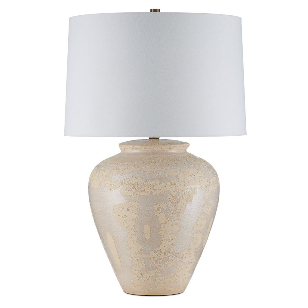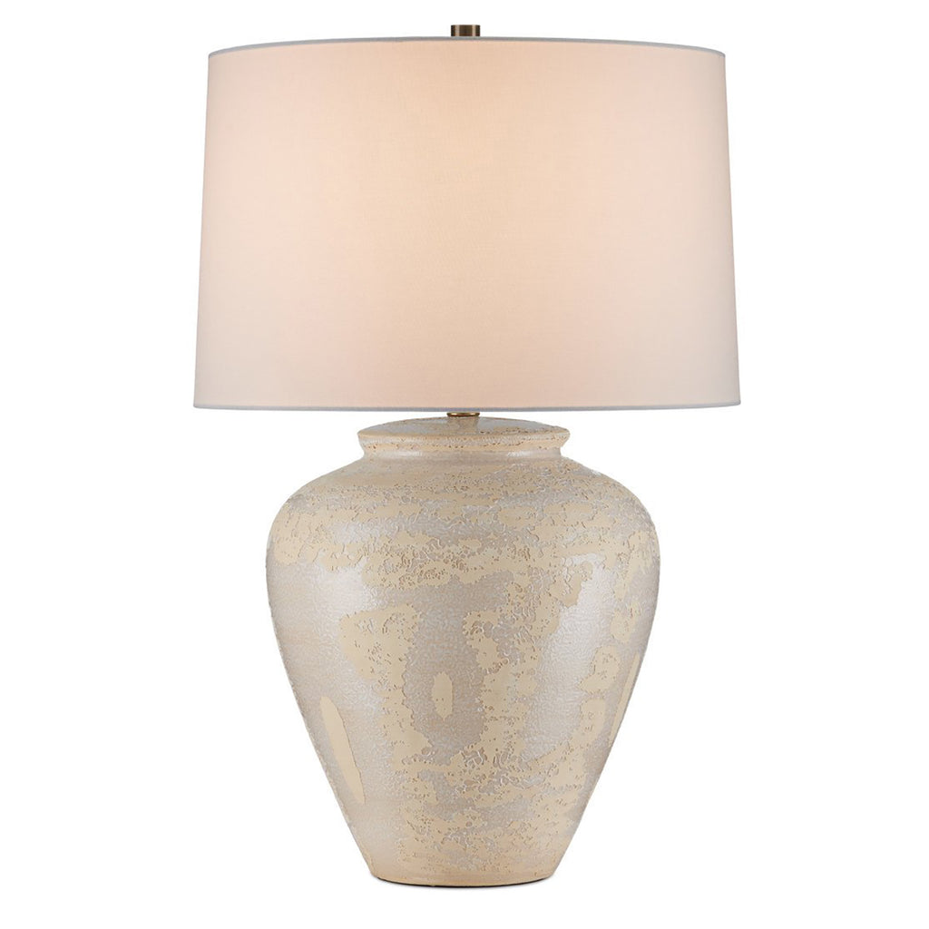 The Currey & Co Mimi Ivory Table Lamp is made of ceramic with a mix of ivory and cream glazing, which creates a swirling pattern to give its surface tone-on-tone depth. The ginger-jar shape of the cream-colored lamp is topped with an drum shade that echoes the pale hues in its body. The artisanal quality comes into full view when the surface of the lamp is viewed close up.