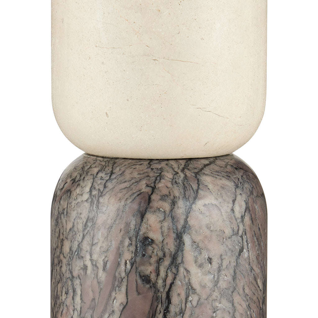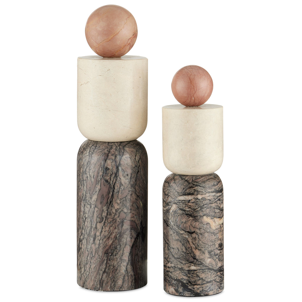 The Currey & Co Moreno Marble Objects Set includes two sculptures made of Rosa Cappuccino Marble, Camello Neve Marble, and Breccia Marble. The geometric sculptural pieces have tremendous personality because of the veining on two of the marbles, and the fact that the dynamic surfaces of the black and pink marbles contrast the pale softness of the other. The surfaces of the objects will vary from piece to piece, given the sculptures are made of natural stone.