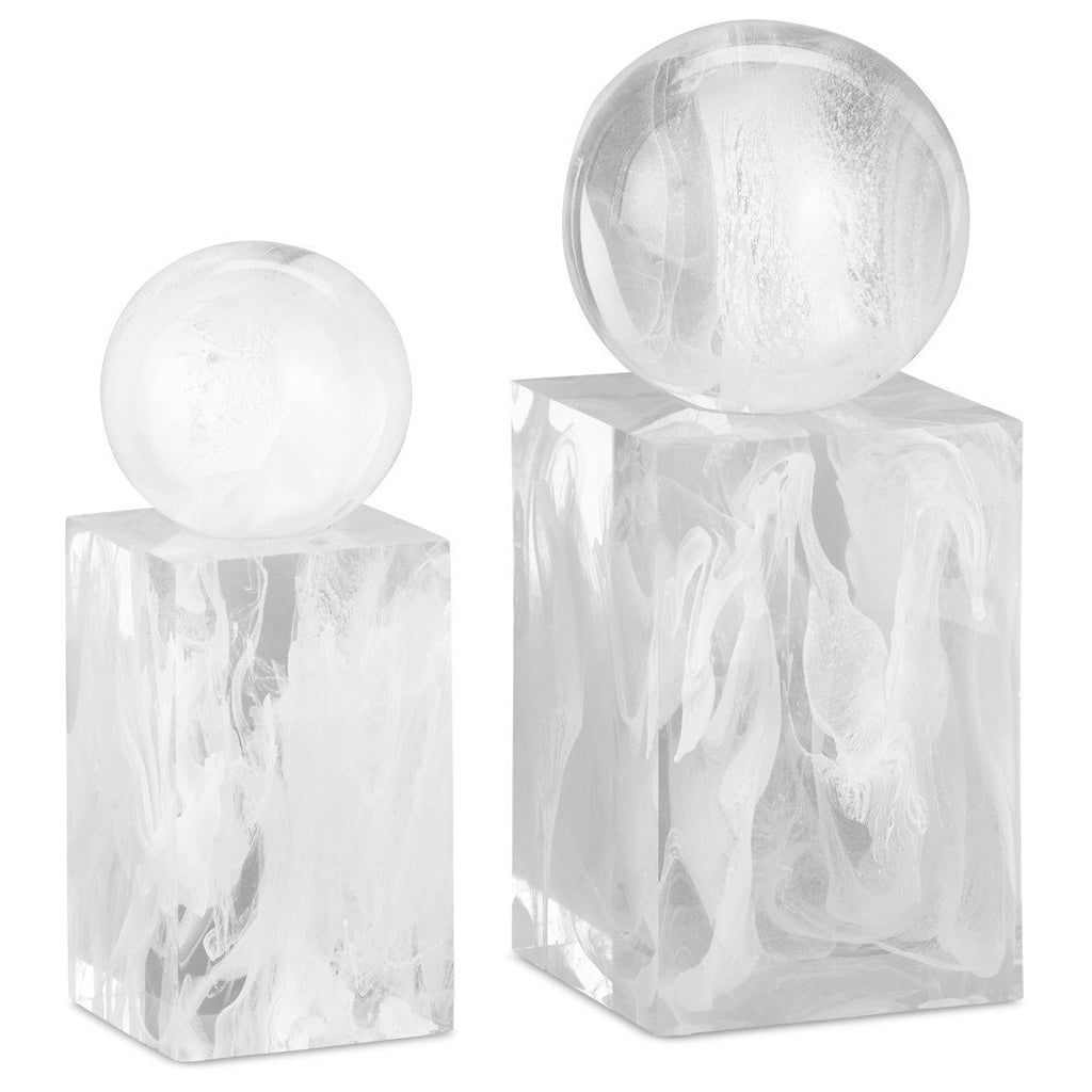 A nod to rock crystal, the Nova White Objects Set includes two balls sitting atop rectangular bases; both the orbs and the supports made of clear composite swirling with white. The billowing effect, which mimics milk that has been poured into water and frozen in time, gives the decorative sculptures a sense of movement. Though these will be unobtrusive decorative objects given their transparency, they will effervesce when light strikes them. Because of the nature of the material, each sculpture will vary slightly.