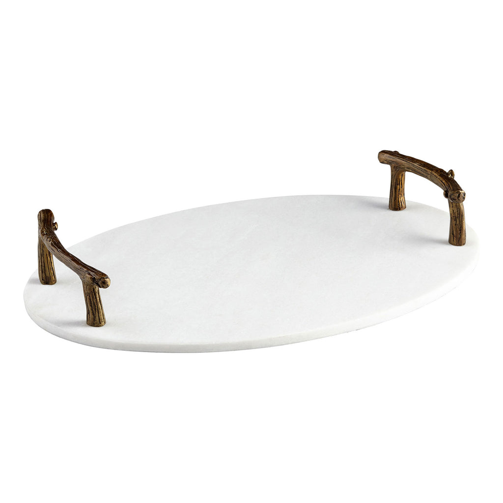 Give tabletops and shelves an eclectic boost with a decorative tray from Cyan Design. This unique storage tray décor offers versatility and function while meshing with your distinctive style. The Cyan Design Marble Woods tray gives an instant sense of lavish elegance to any formal dining room. With its gentle curves and bronze finished iron handles, this marble tray creates the perfect cocktail bar setting.
