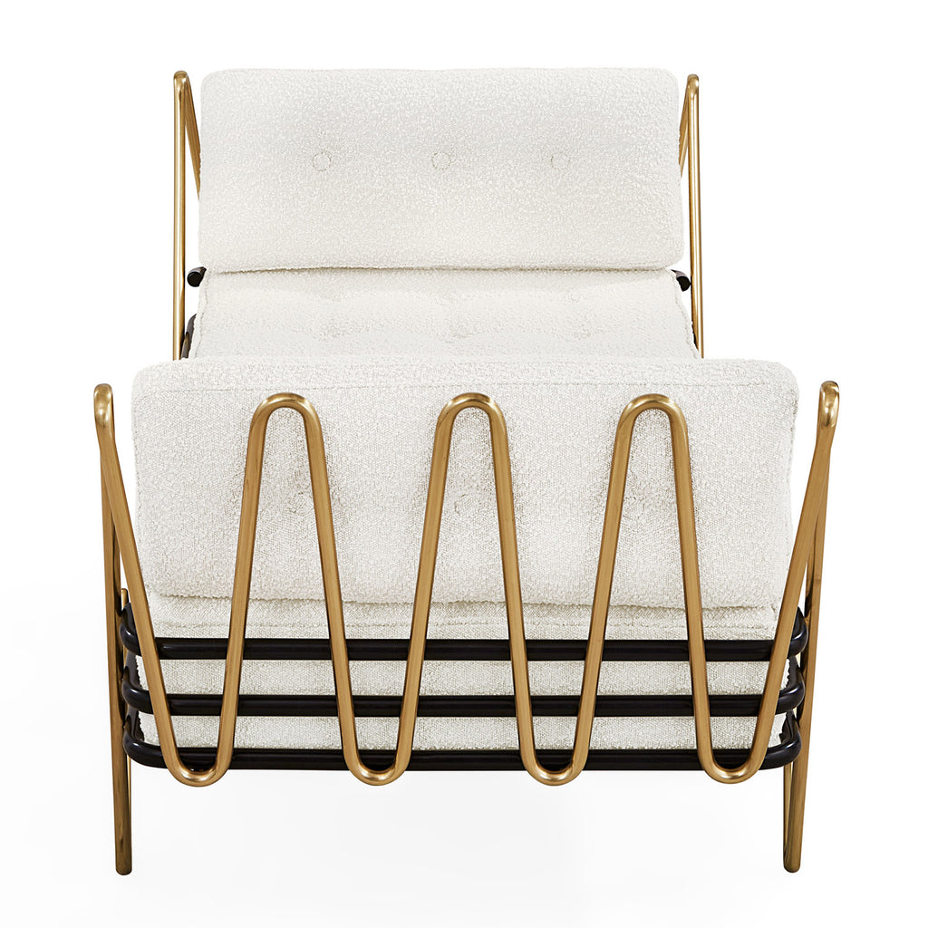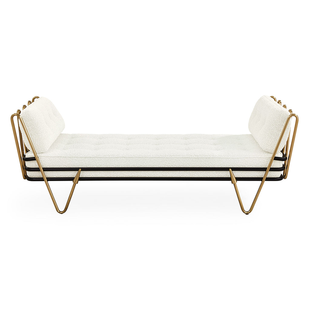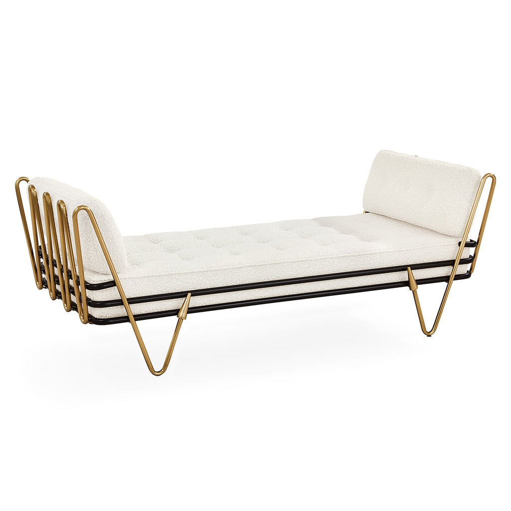 Sinuous, sculptural, surprising—our Maxime Daybed hits all the right notes. A gleaming brass frame cradles a soft cushion upholstered in chic and dreamy Olympus bouclé. Arrow sabots and shiny brass buttons crank up the glamour. Every decorator's secret weapon, daybeds add unexpected polish to a living room when placed opposite a sofa, or bring a neglected corner to life. Our Maxime is perfect for an overnight guest, sassy socializing, or the occasional sneaky snooze.