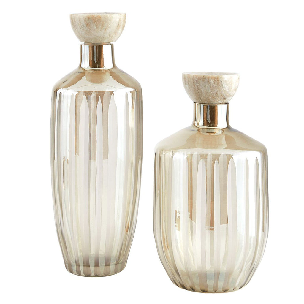 Inspired by vintage perfume decanters. Ribbed vessels of smoke luster-cut glass are topped with sculptural stoppers of gray marble and accented with nickel finished brass details. Set of two. Finish will vary.