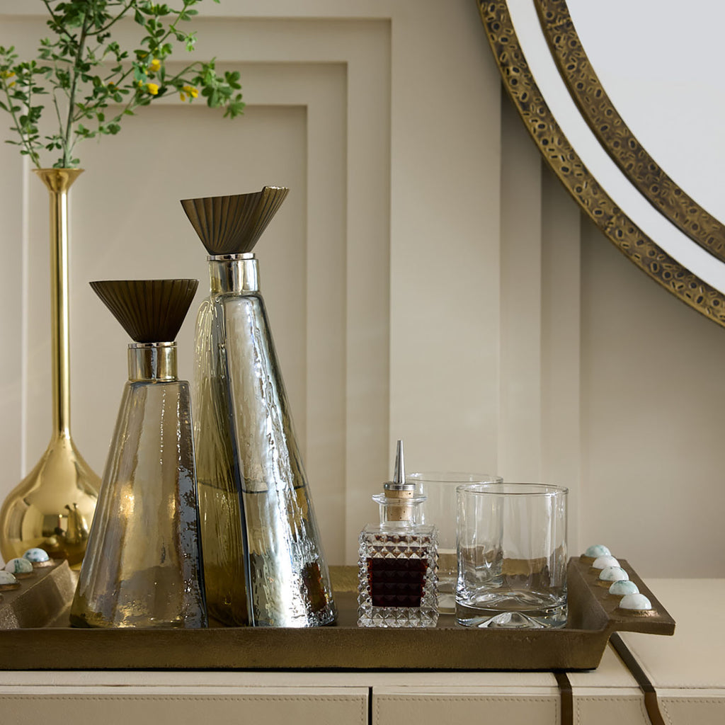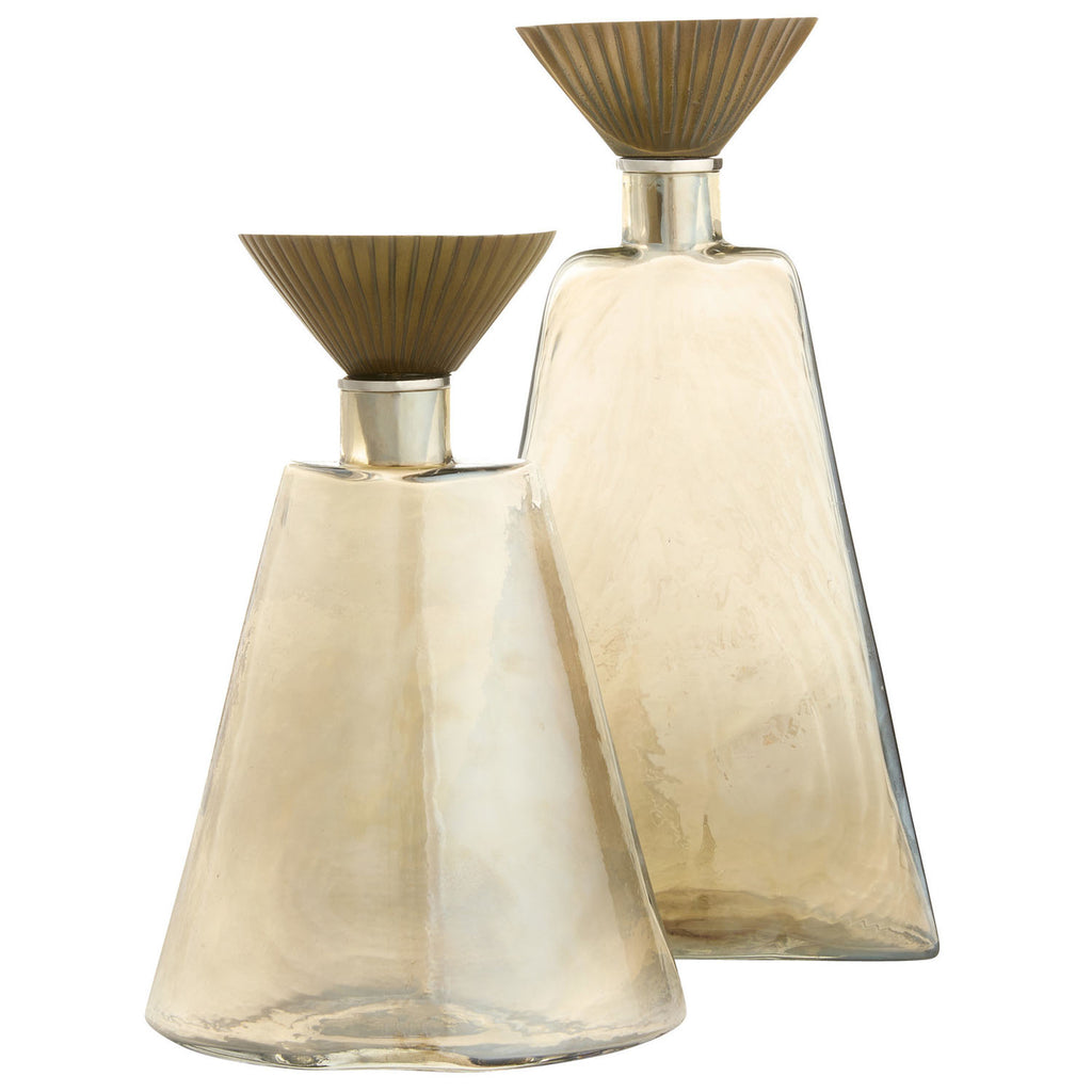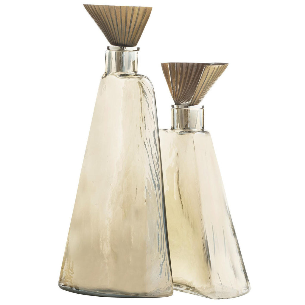Our pair of smoke-luster glass containers was designed to elevate any credenza or bar cabinet. Each decanter's handmade texture is complemented by a Gingko-leaf-inspired stopper of antique brass cast aluminum. Display separately or nested together as a pair. Finish will vary.