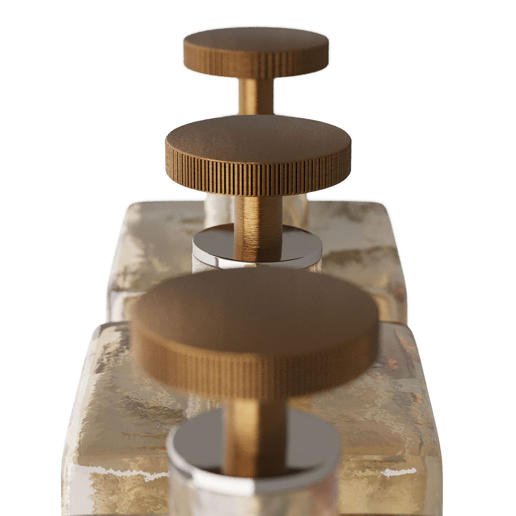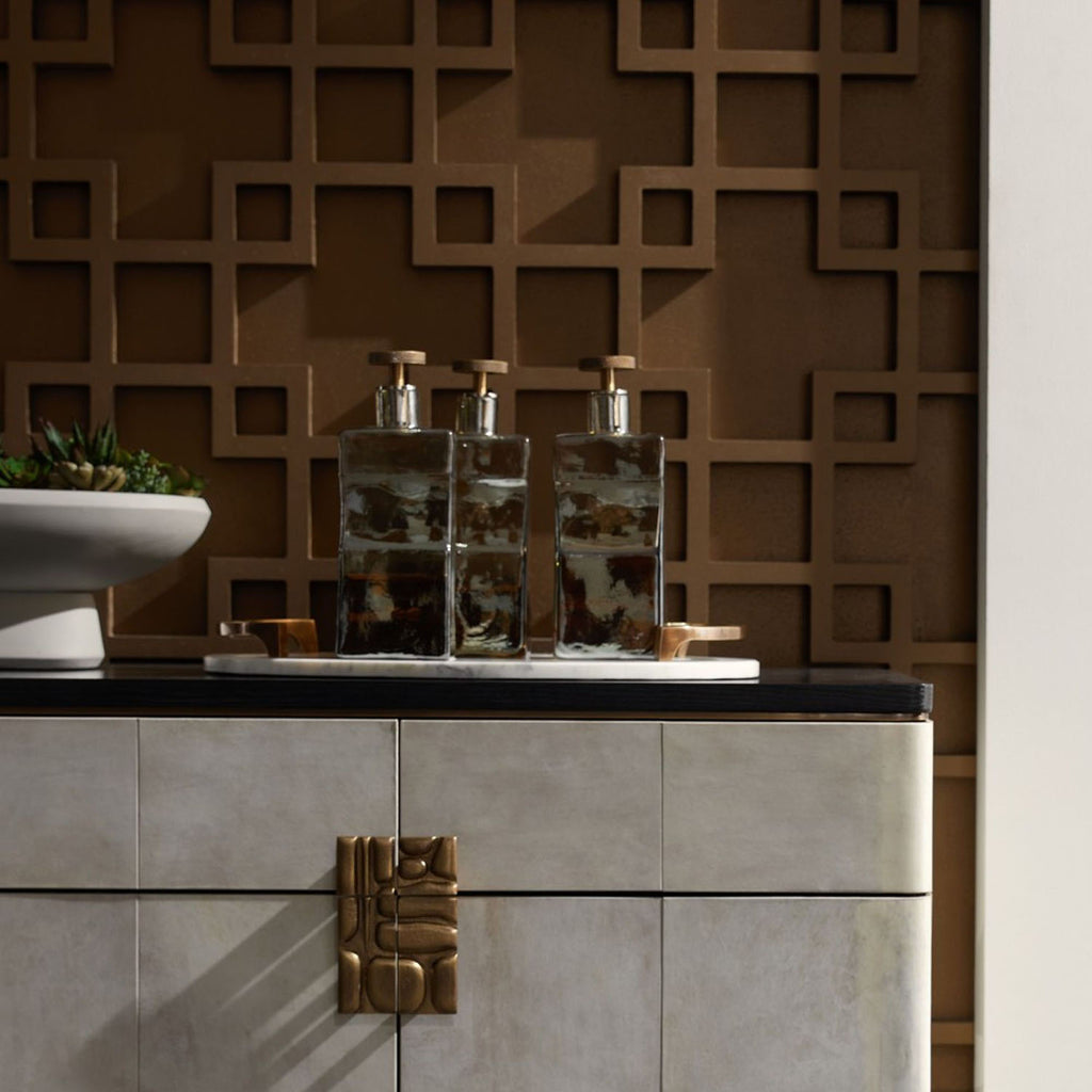 Decanters of smoke luster glass make an industrial-inspired statement. Designed with free form indentions for a handmade feel, each cast sculptural design is topped with a ribbed stopper of vintage brass. Set of three. Finish will vary.