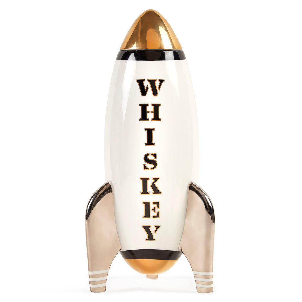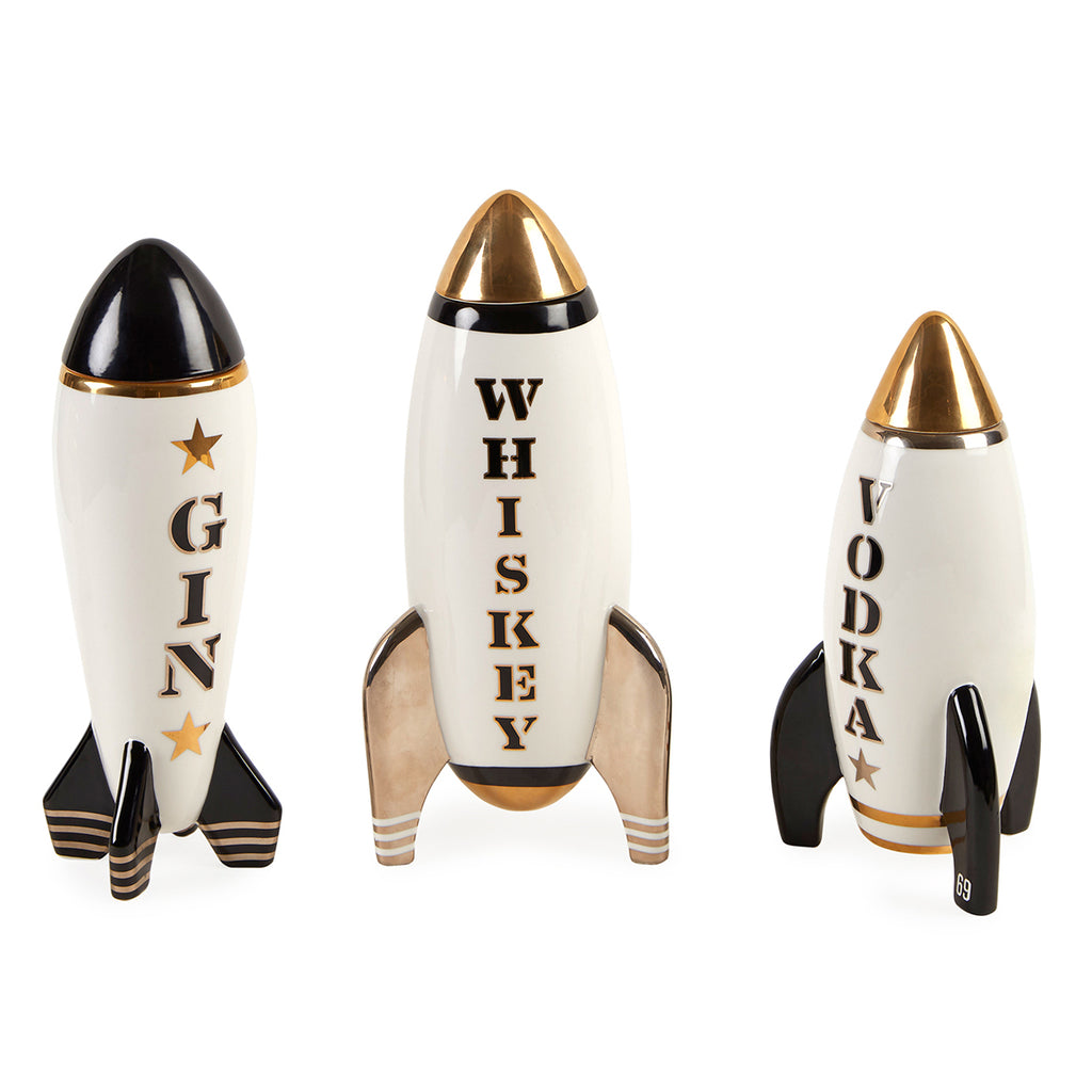 Send spirits into orbit with the Jonathan Adler retro-rad black and 16-karat gold luster porcelain decanters. Embellished with bold suggestions of what to stash in each—even bottom shelf booze becomes out-of-this-world. Equipped with hard-working gaskets for optimal spirit storage. A stylish sophisticate deserves a fully styled bar to match.