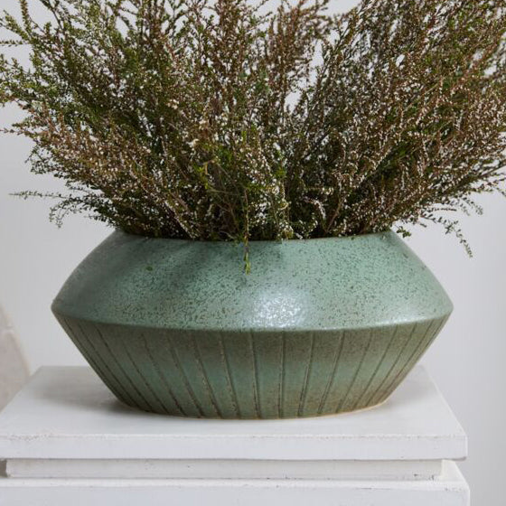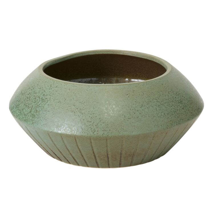 With its artful, old-world look, the large ceramic Gwendolyn Bowl is a timeless addition to a styled coffee table, console, or dining table. This vessel features an angled shape that tapers up from the base, a green reactive glaze, & carved lines that wrap around the bottom half for subtle texture. Style as a statement home decor centerpiece filled with multiple orchids or succulents, a drop-in plant, or decorative objects.