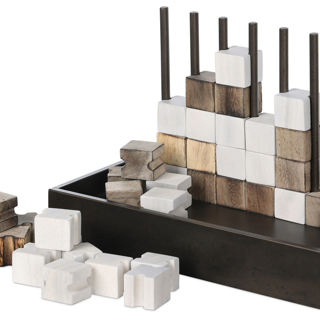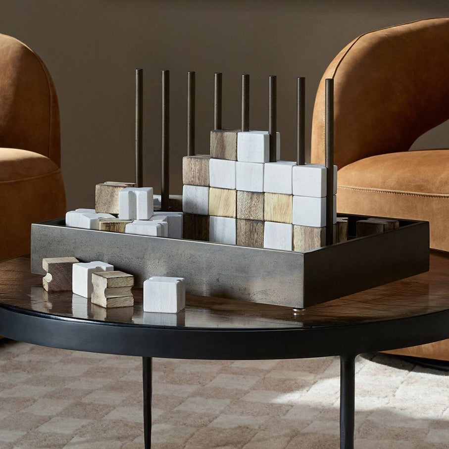 Decorative and functional, this eye-catching game of Four in a Row is crafted of solid recycled wood and iron in a rustic finish. With its geometric lines and clean shape, box can easily rest on a coffee table or shelf as decorative display.