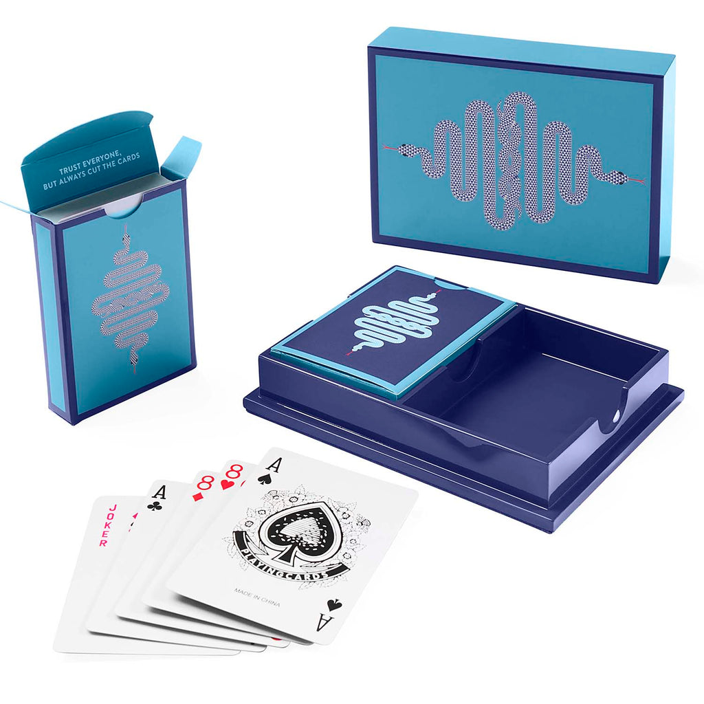 Charm your companions on game night with our Eden Lacquer Card Set. Store your decks in a fierce high-gloss lacquer box featuring an intricately intertwined duo of slithering serpents. A chic cocktail table accent on its own, each box houses two standard playing card decks emblazoned with more ravishing reptiles.