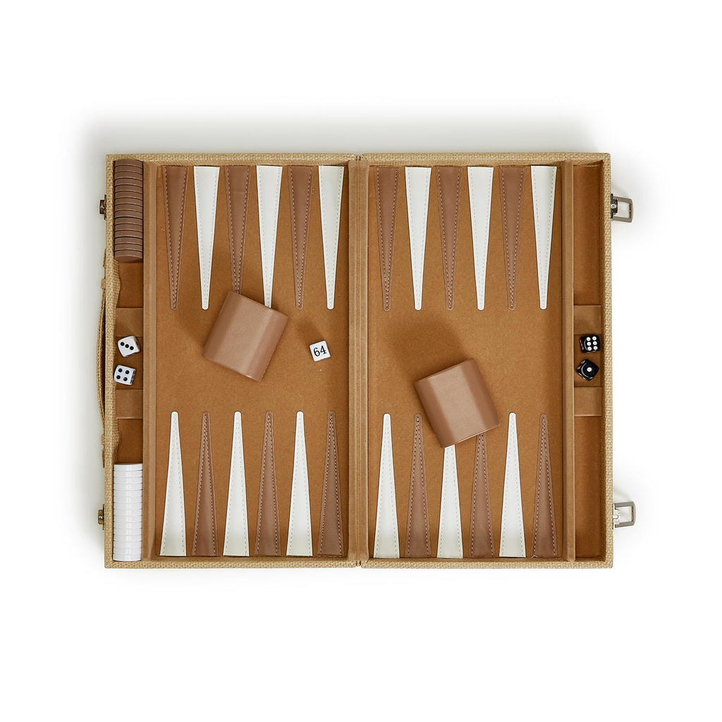 This backgammon set game is the perfect classical board game to take with you anywhere! The backgammon board game comes with a premium vegan leather playing field with leatherette pips and organizational sections for checkers and accessories. Features such a warm natural color palette.