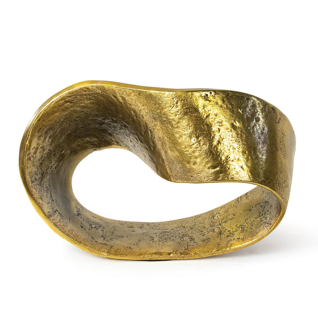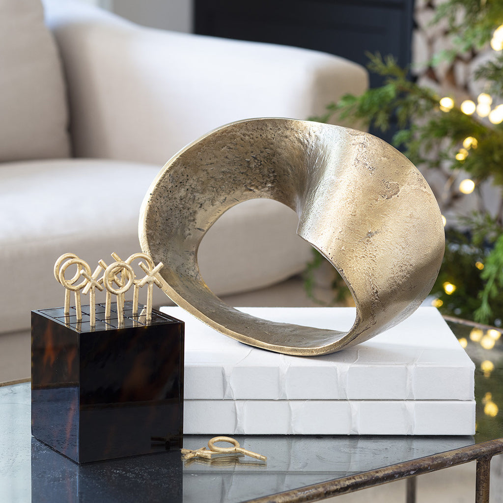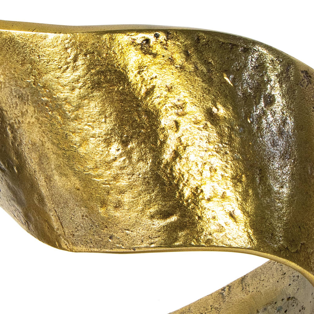 An infinity knot was crafted out of aluminum and cast to capture a textured surface. This object is an industrial work of art. Place on a bookshelf in a living room for a sculptural statement.
