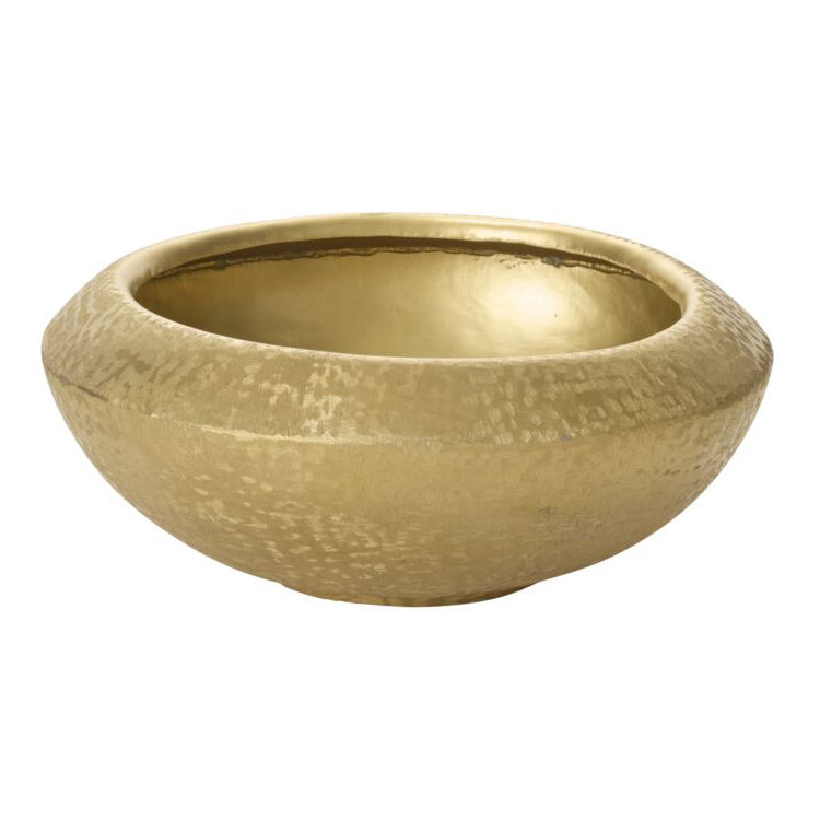 Large scale, yet lightweight, the Blaze Bowl is a gold metal vessel sure to make an impression at any event. Small sections of hand carved lines scattered across the surface of the bowl in an irregular pattern create a unique contrast of smooth vs texture. The brilliant gold hue is balanced by the texture, and the tapered opening with a rolled rim is ideal for holding floral mechanics and a statement arrangement in place.