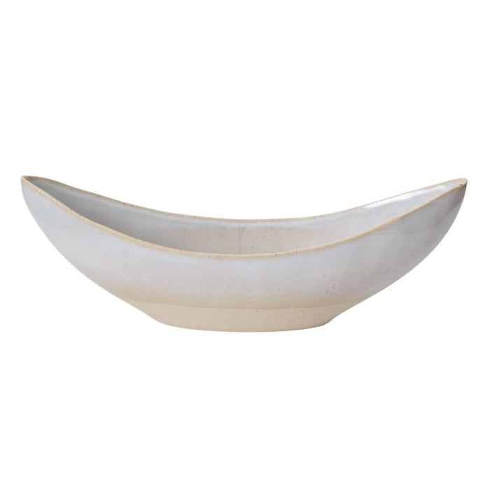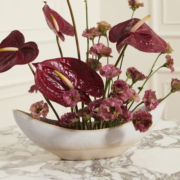 Create an elongated floral statement in the beautifully shaped Carys Boat, a ceramic vessel with ends that curve upward into a crescent shape, and a narrow opening. A reactive glaze on a smooth neutral surface balances the unique shape of the Carys, and acts as a versatile base for any color florals.