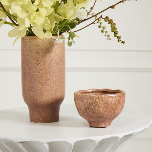 Scalloped edges top off the warm terracotta hued surface of the Cyrus Bowl, a small scale ceramic bowl, perfect for event florals or a home decor moment. Variation in the hand painted finish give this collection a beautiful and artful look for monochromatic arrangements or even plantings. The Cyrus Bowl, Compote, and Vase are designed to be arranged in a grouping or to be styled throughout an event for a cohesive look.