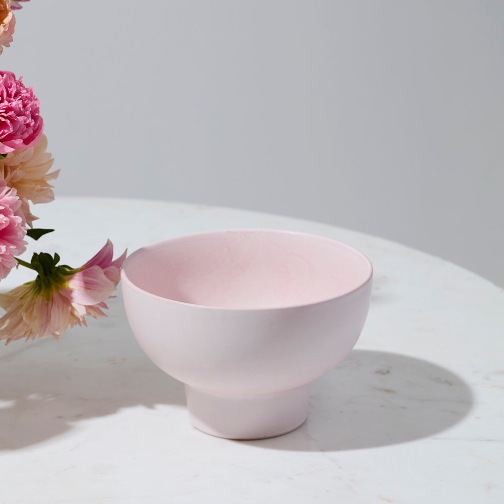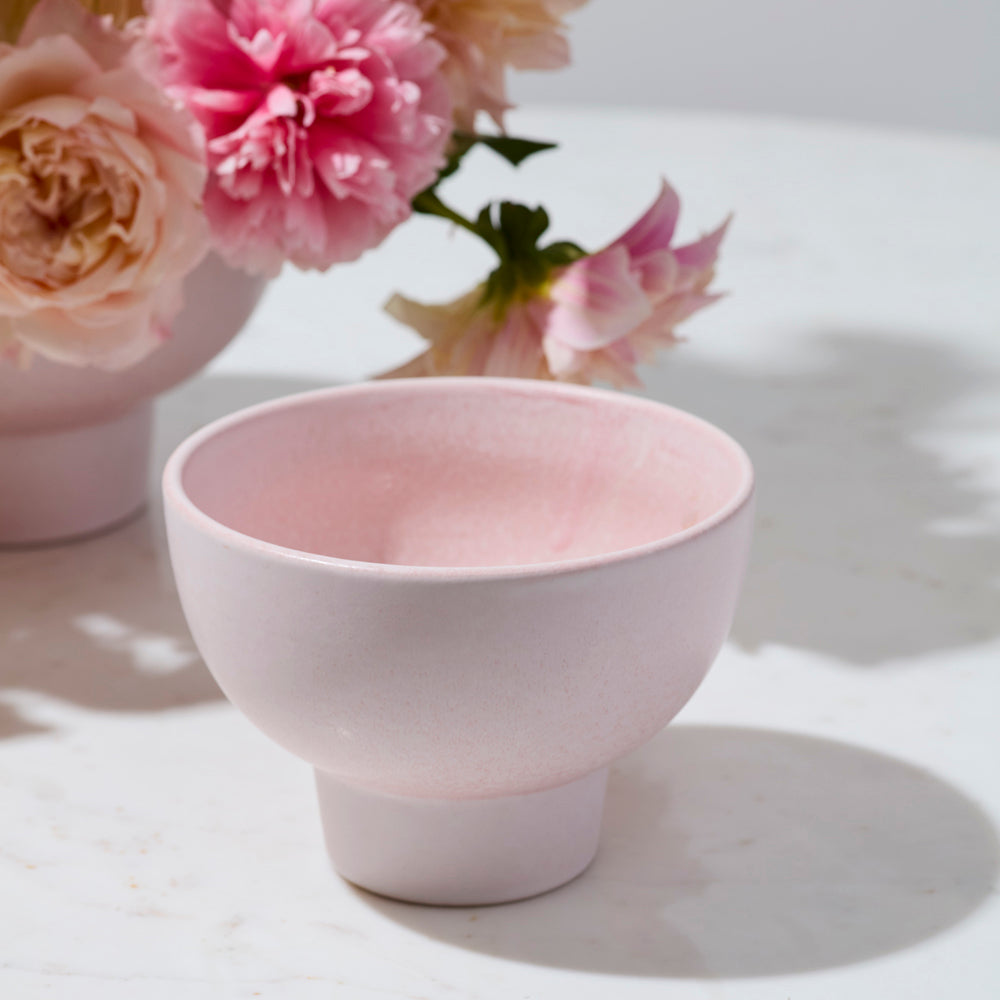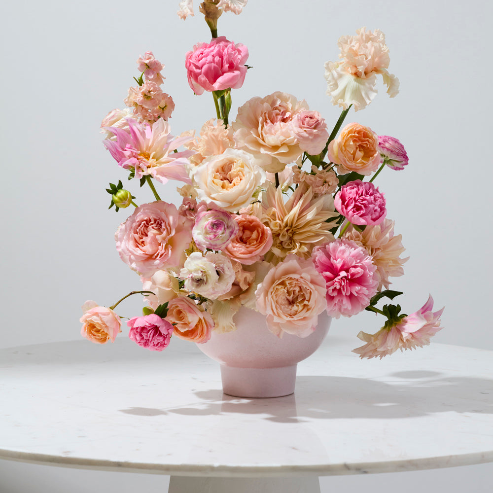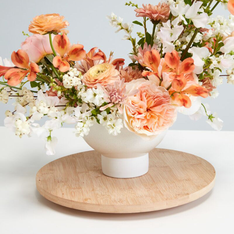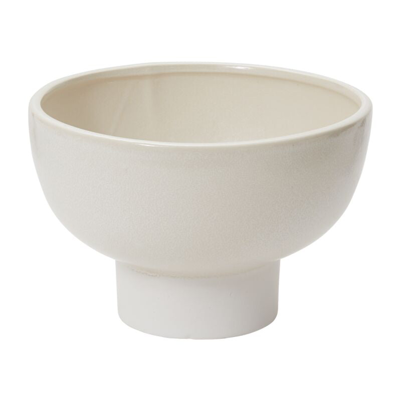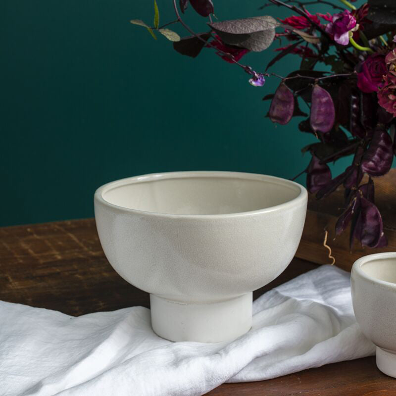The modern ceramic Elijah Compote is the versatile piece you’ve been looking for to complement home or event décor. Available in 3 sizes & created with sustainable floral design in mind, this piece features an open foot for long stems, holds lots of water, & accommodates various floral mechanics. Featuring a glossy, off-white reactive glaze with a bit of texture, this warm toned neutral vessel offers an easy, elevated look for sweeping floral designs or the simplest potted plant.