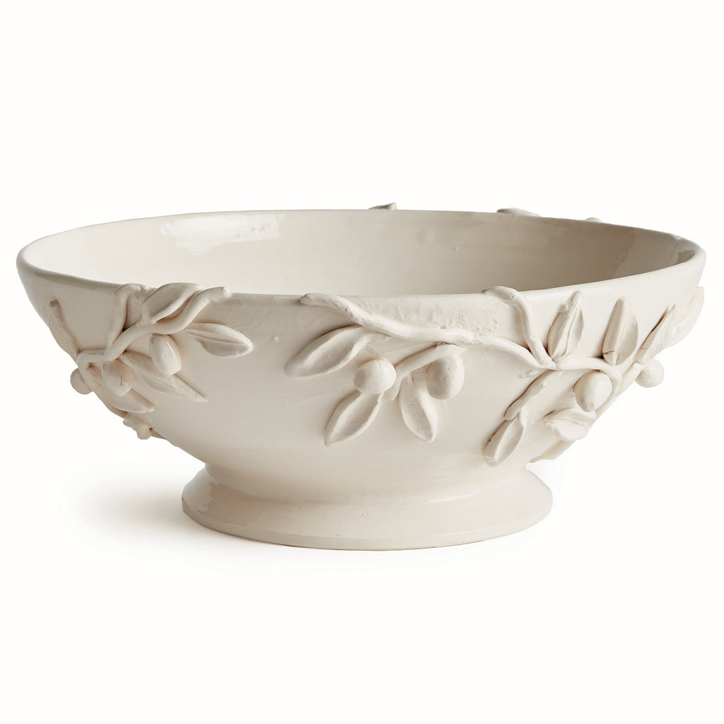 Each and every distinctive olive detail of the Olivella Footed Bowl is handmade, and hand-applied by Italian artisans in Tuscany, Italy. A subtle, open design in a soft white glaze. With a classic Italian craftsmanship passed down through generations, each piece is a true original. In grand scale, a dynamic centerpiece for feature table, kitchen island or mantel.