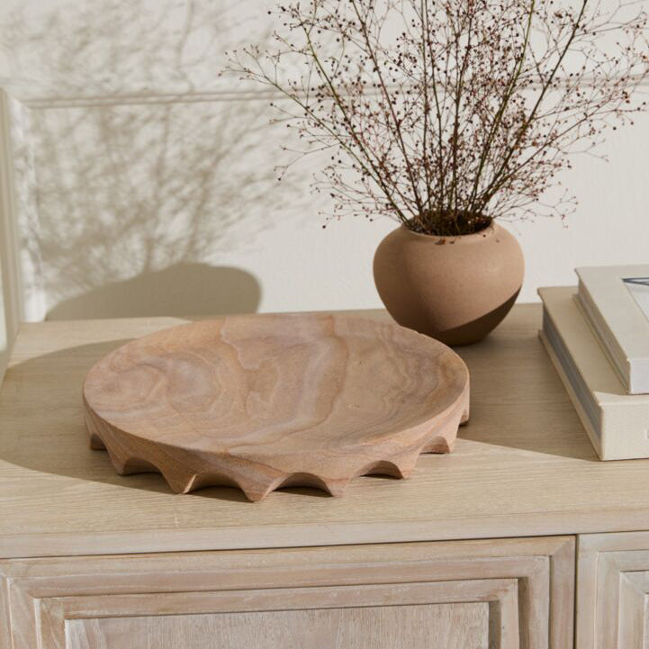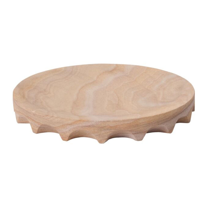 Nothing says timeless like the handmade sandstone Coliseum Tray. Featuring a scalloped base, smooth, polished finish, & a pinkish base hue with warm sandy & grey veining swirled into the surface, this low, circular, shallow tray makes a statement no matter how you style it. This home accent stands out as an art piece on a console or coffee table with a candle or decorative objects displayed inside.