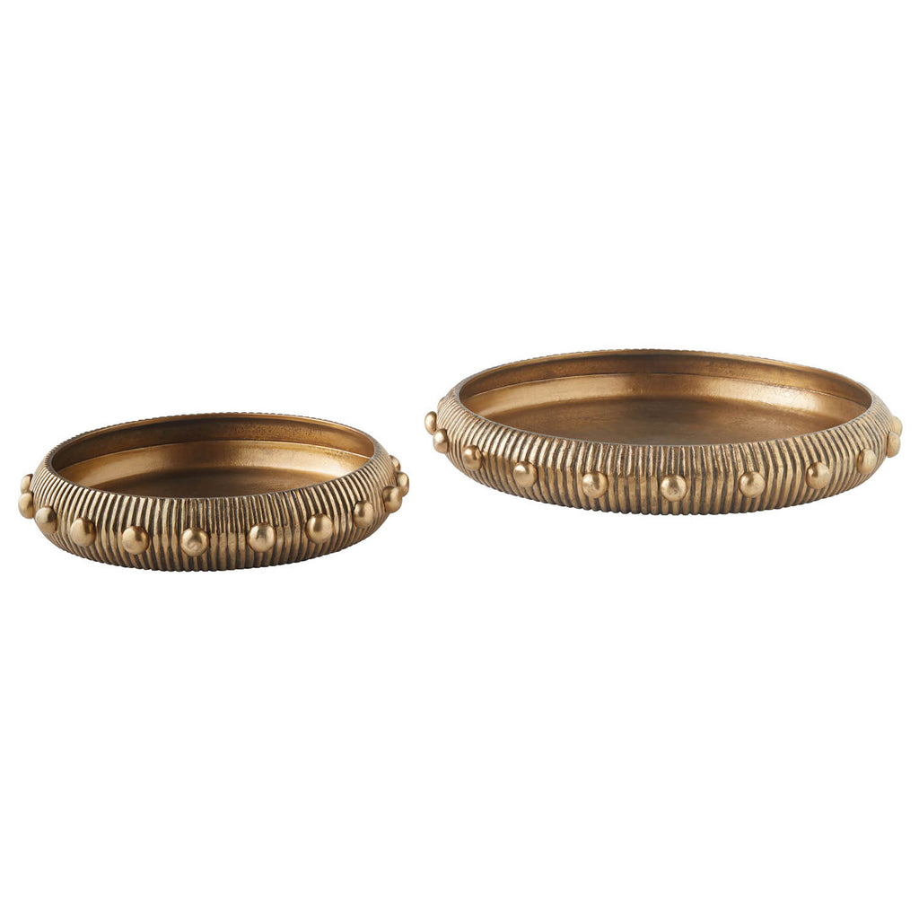 The Batten collection leaves an indelible mark through intricate design and meticulous detail. This large-scale cast aluminum tray bears an antique brass finish that accentuates the crevices of its vertical ribbed texture. A polished brass-finished button detail provides a striking contrast, creating an exquisite focal point. The Batten collection of statement pieces serve as a functional yet remarkable accent to any design.