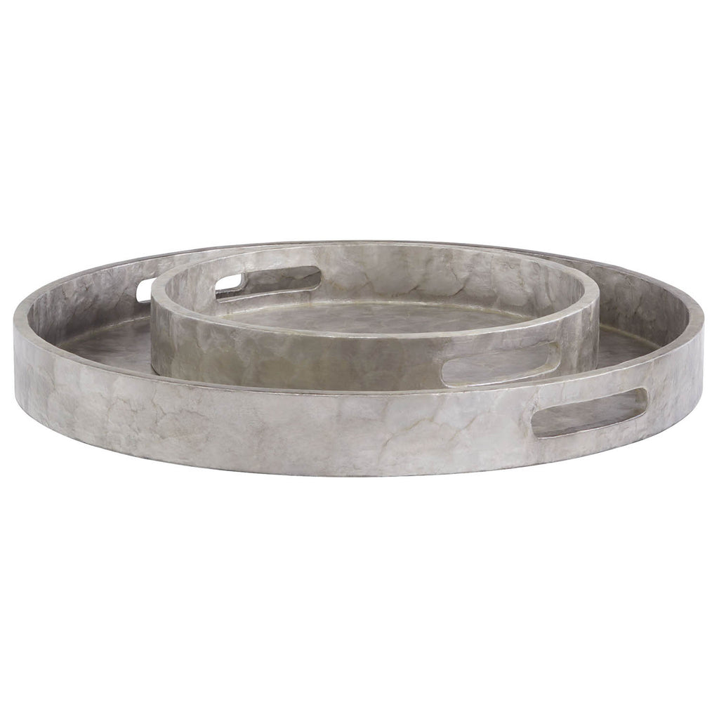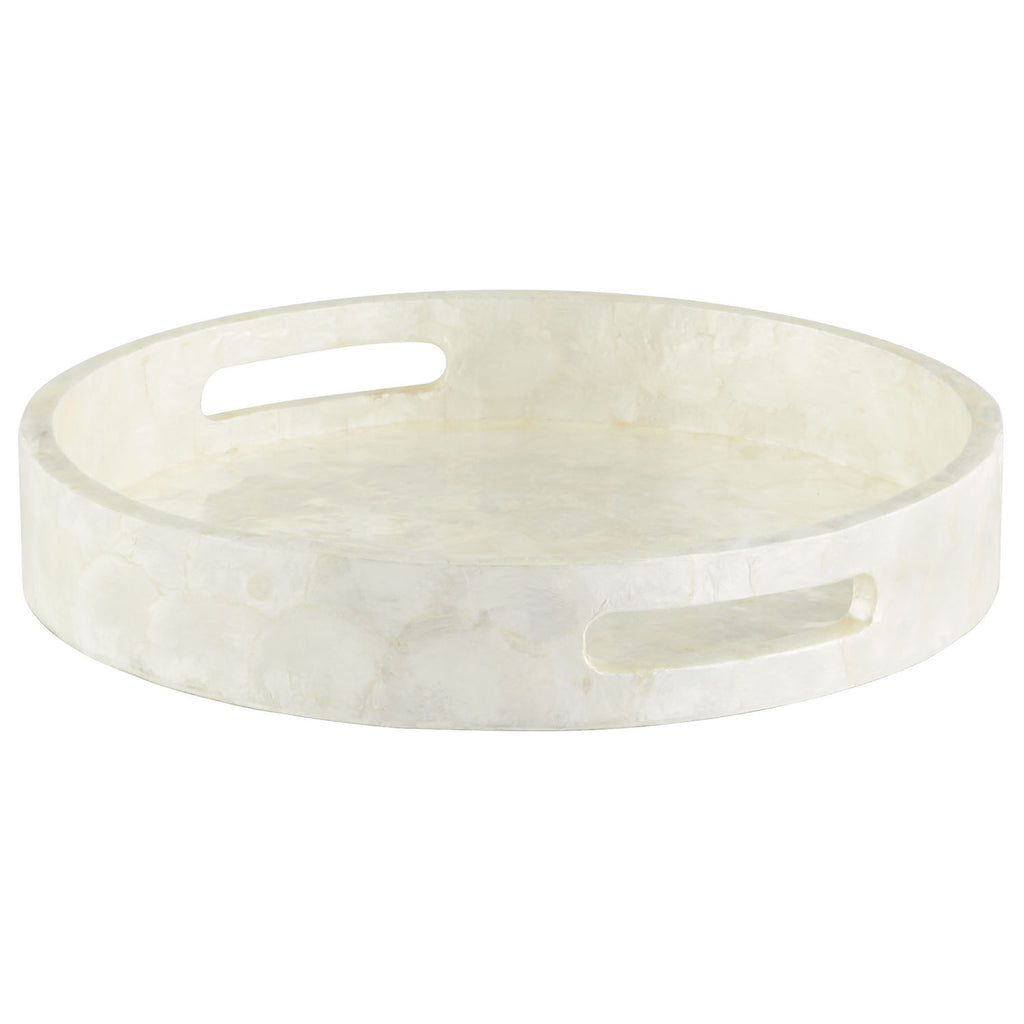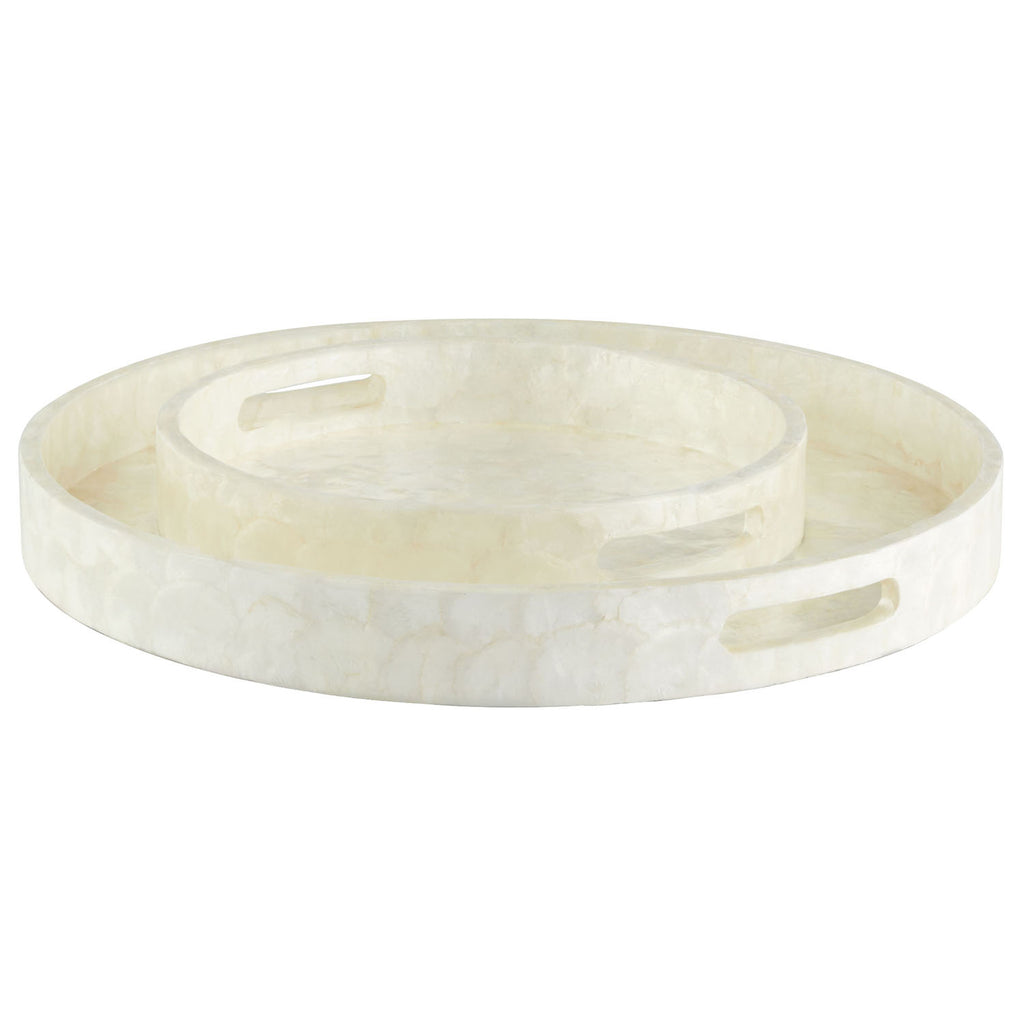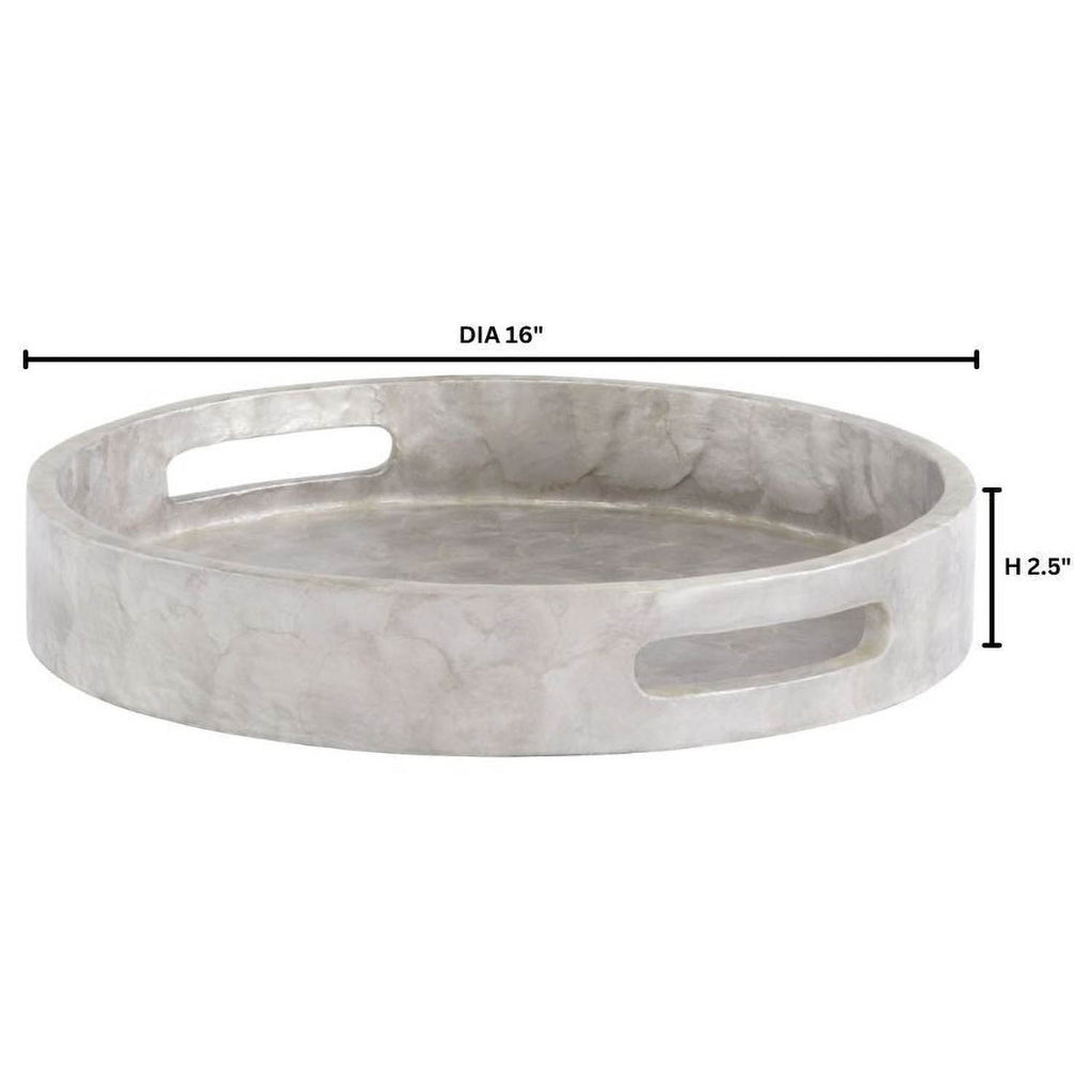 The Triton collection features the centuries-old, enduring beauty of the capiz shell. Harvested from sea mollusks native to Southeast Asia, the capiz shells are delicately fixed to wood trays that feature a raised rim with two cut-outs for handles. Natural tones in the capiz shell add a subtle iridescence. The Triton trays are available in two shapes of two sizes and colorways.